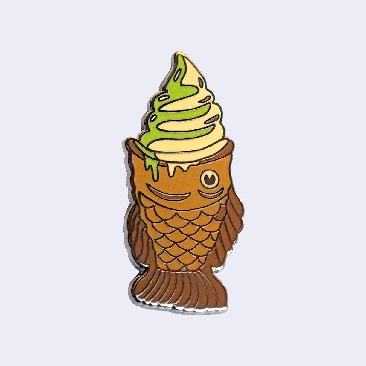 A beloved dessert - matcha swirl soft serve in a warm, fish shaped pastry cone!. What could be better? With 2 rubber backings, this pin is nicely supported for wherever you decide to put it.