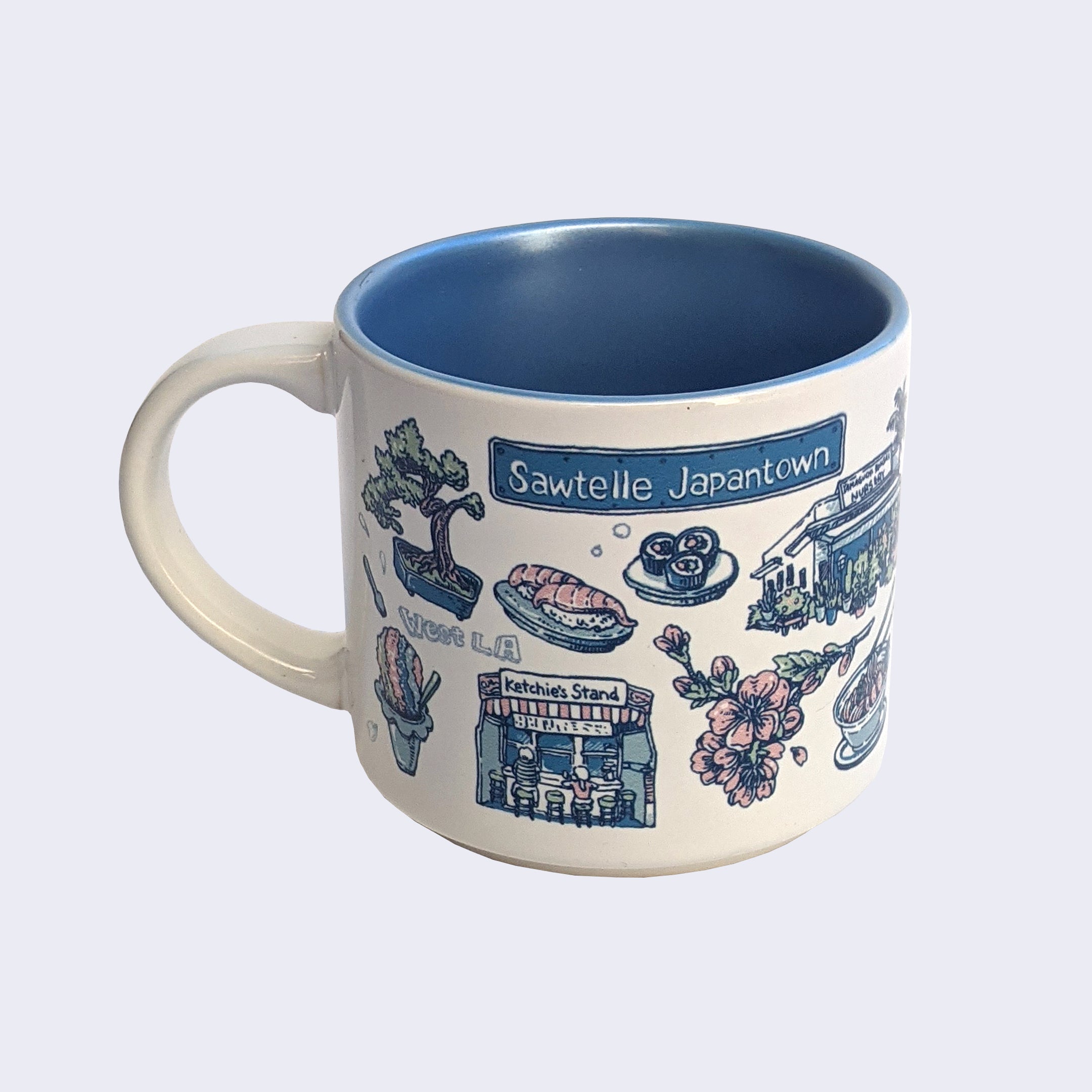 White ceramic mug with a metallic blue interior and various illustrations on it, all within a color scheme of blue, pink, white and green. Illustrations include a bonsai tree, sashimi, sushi rolls, cherry blossoms, a food stall that says "Ketchie's Stand," a street sign that says "Sawtelle Japantown" and a shaved ice cone.