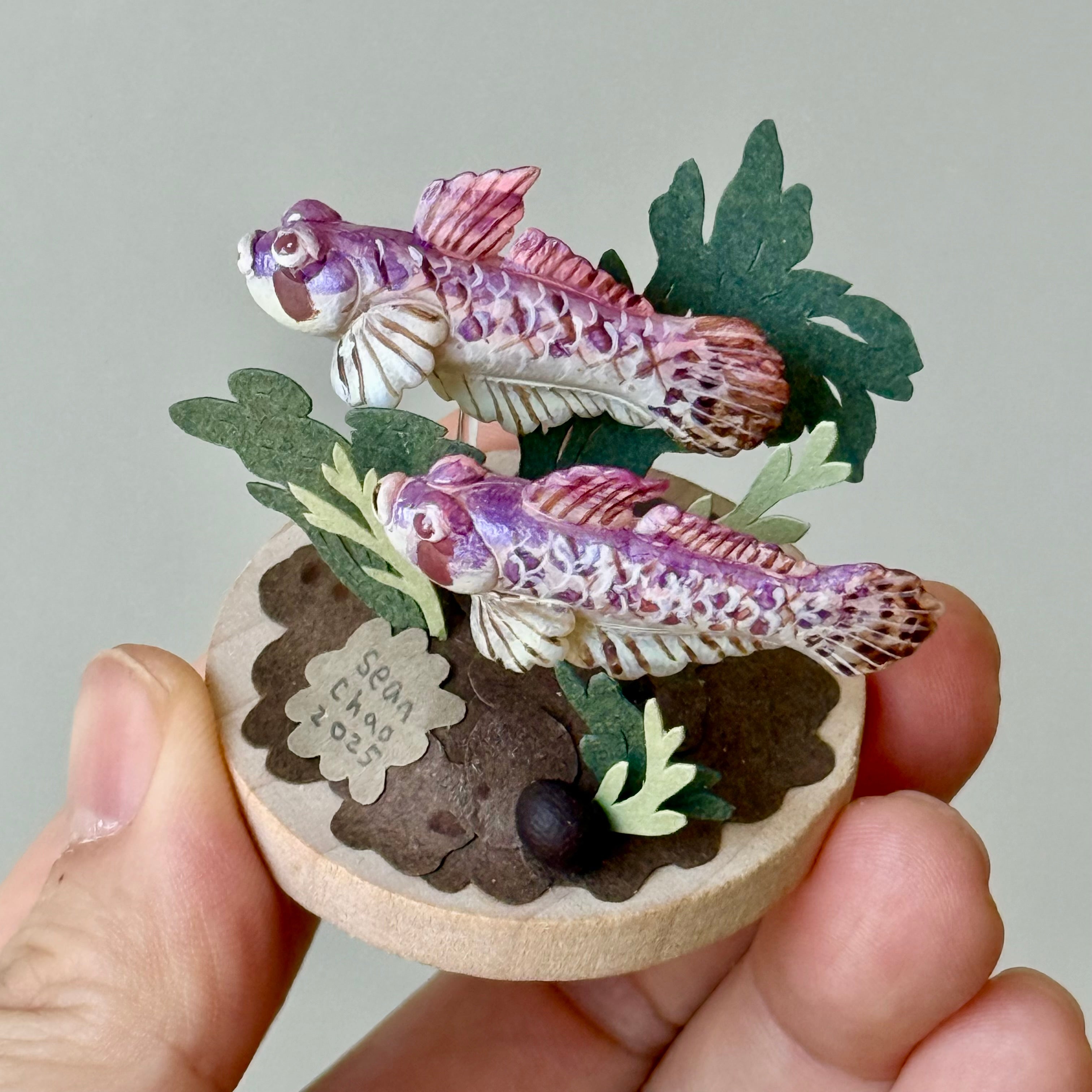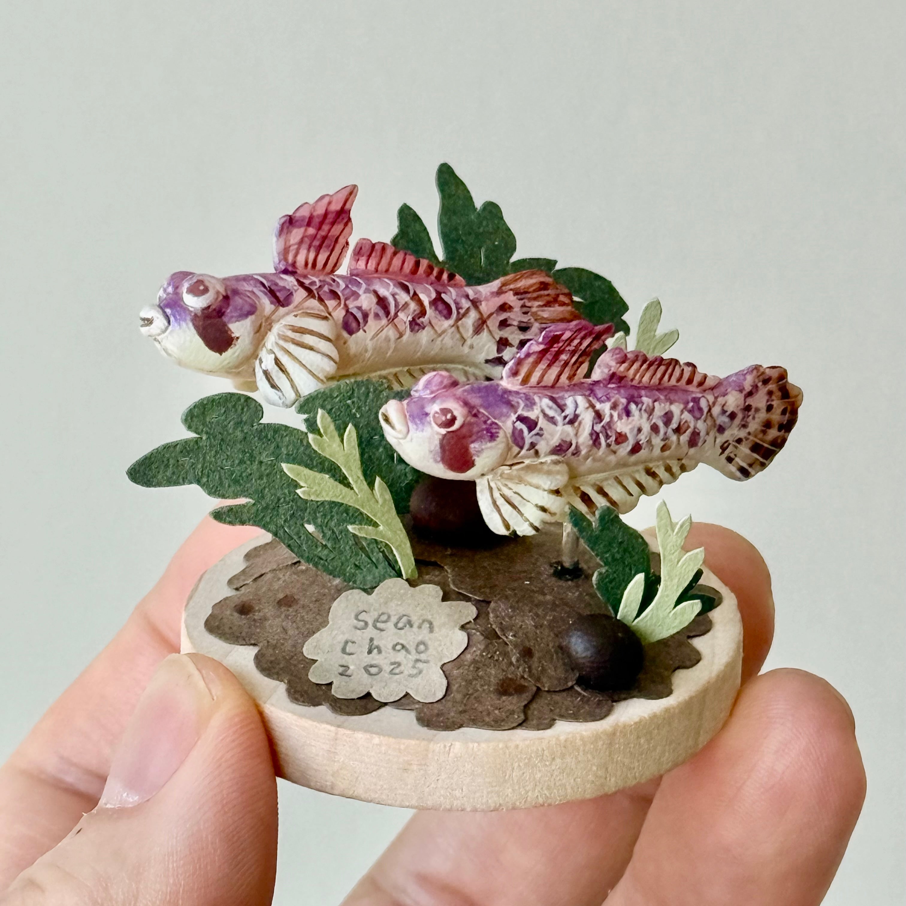 Polymer clay, paper, acrylic paint and wooden disc base.