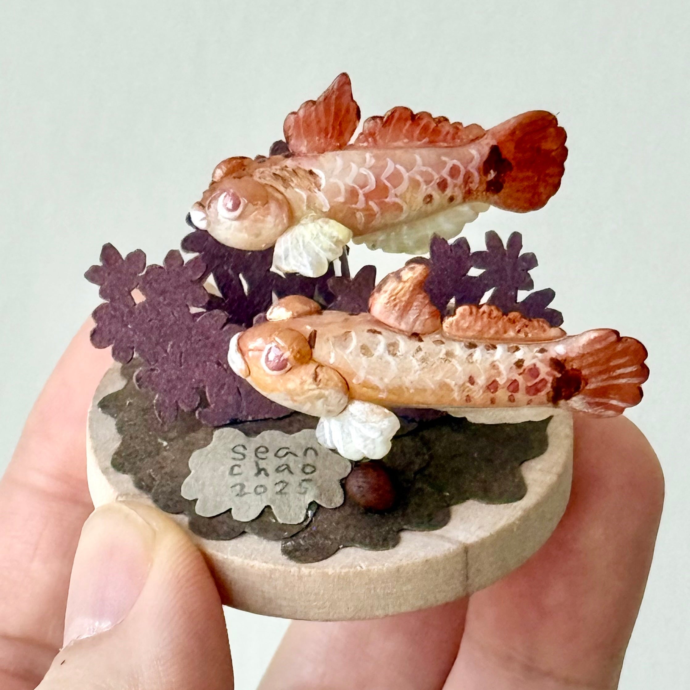 Polymer clay, paper, acrylic paint and wooden disc base.