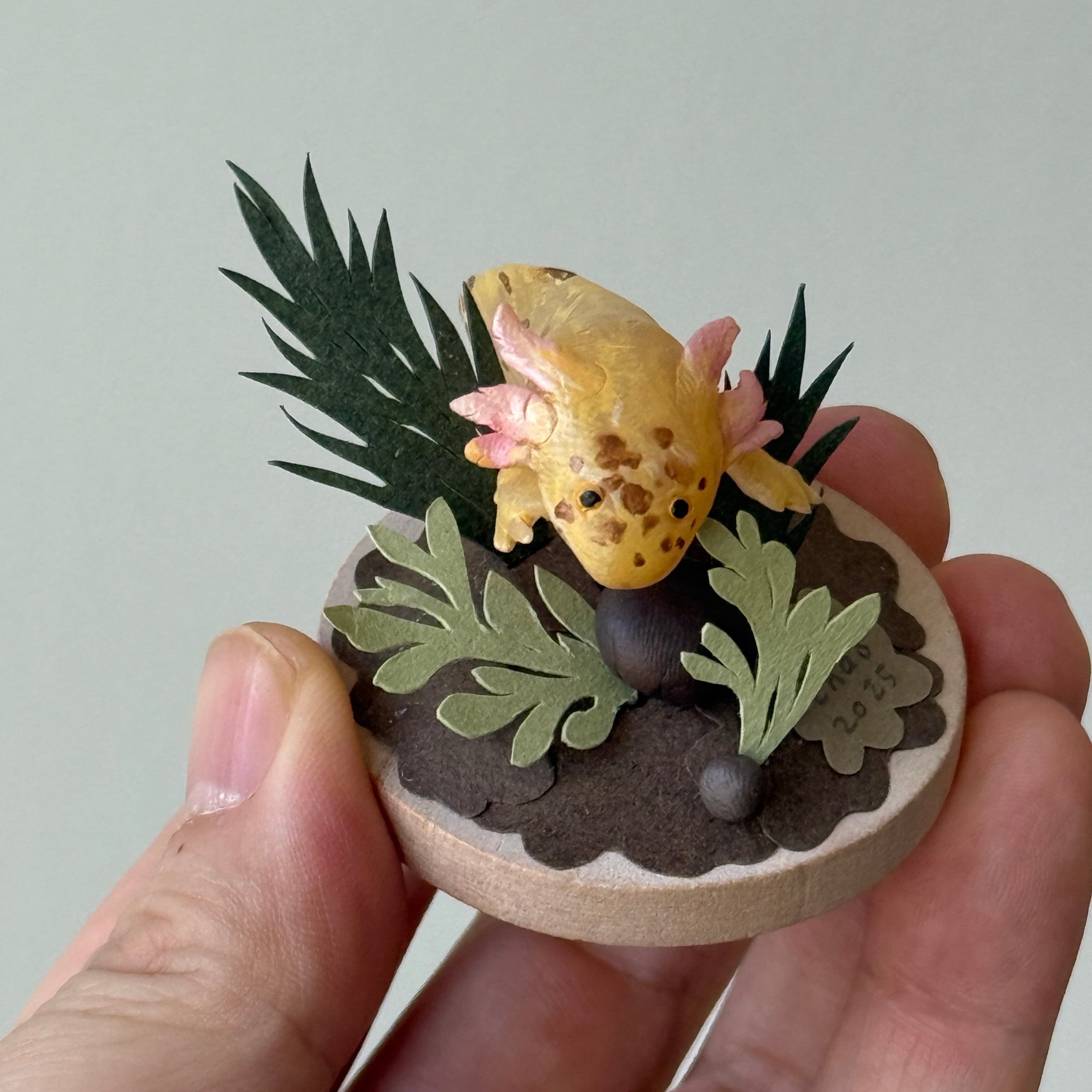 Polymer clay, paper, acrylic paint and wooden disc base.
