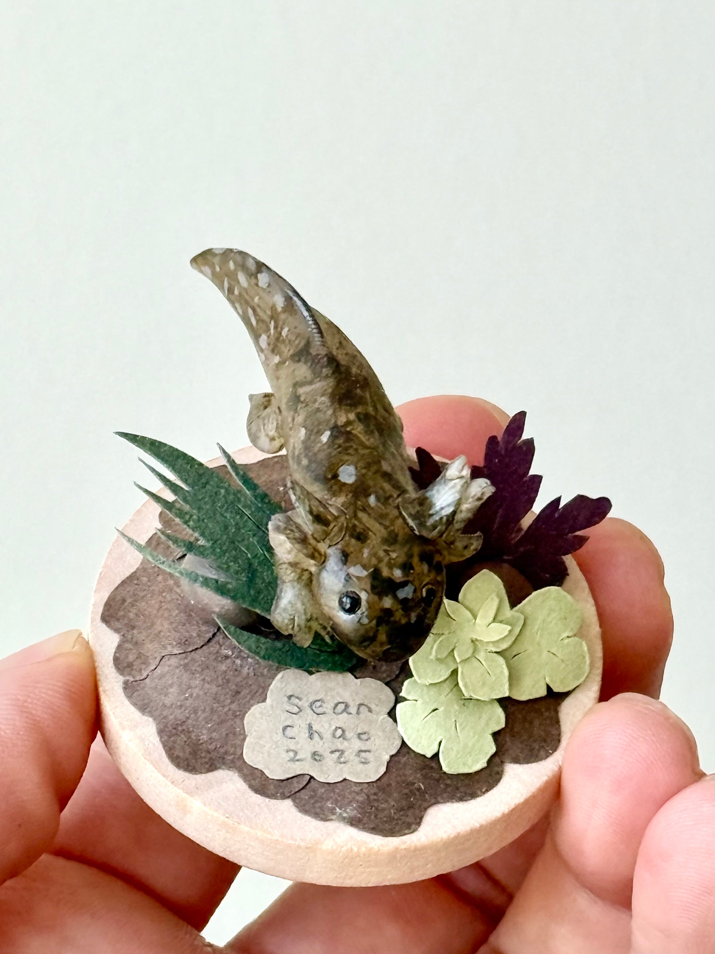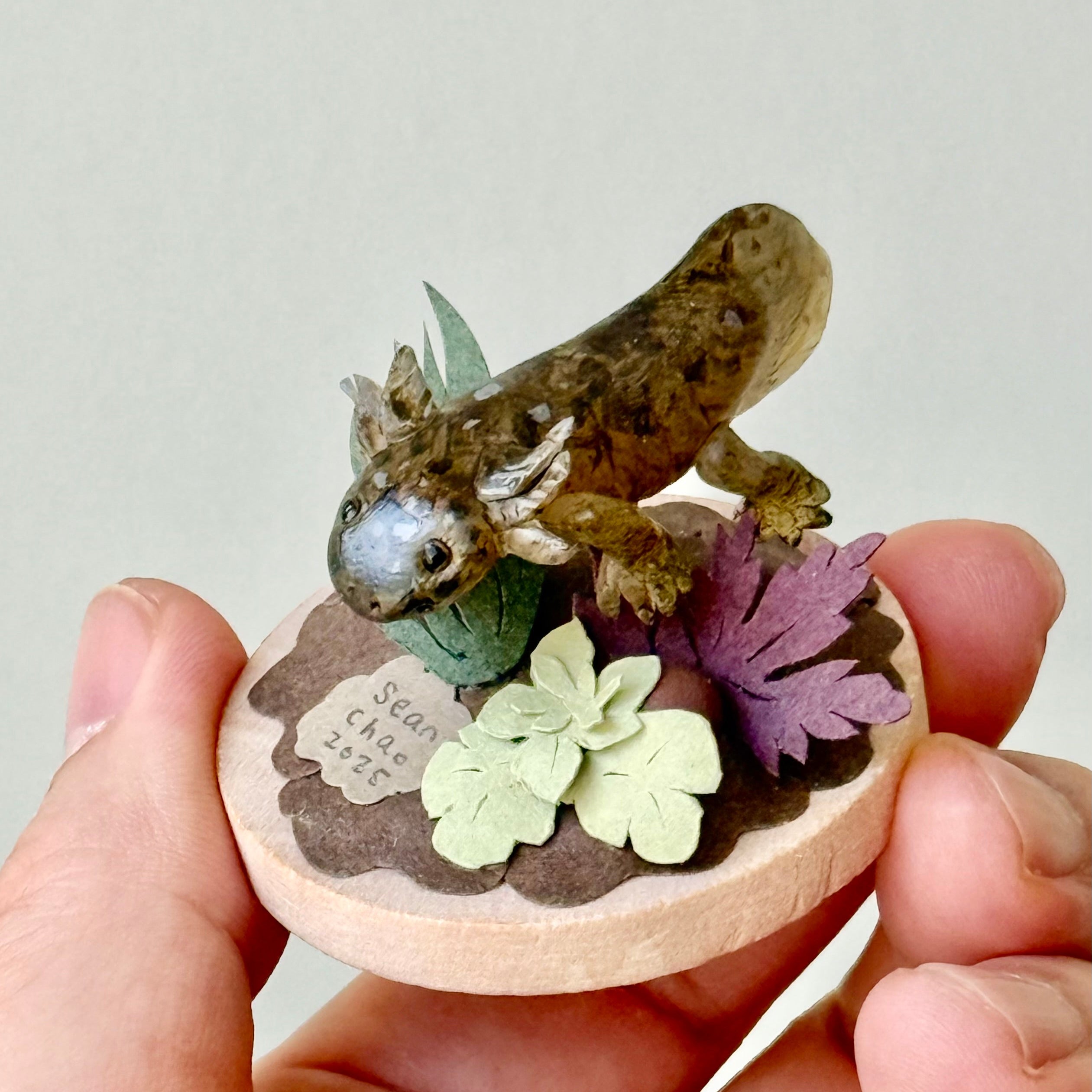 Polymer clay, paper, acrylic paint and wooden disc base.