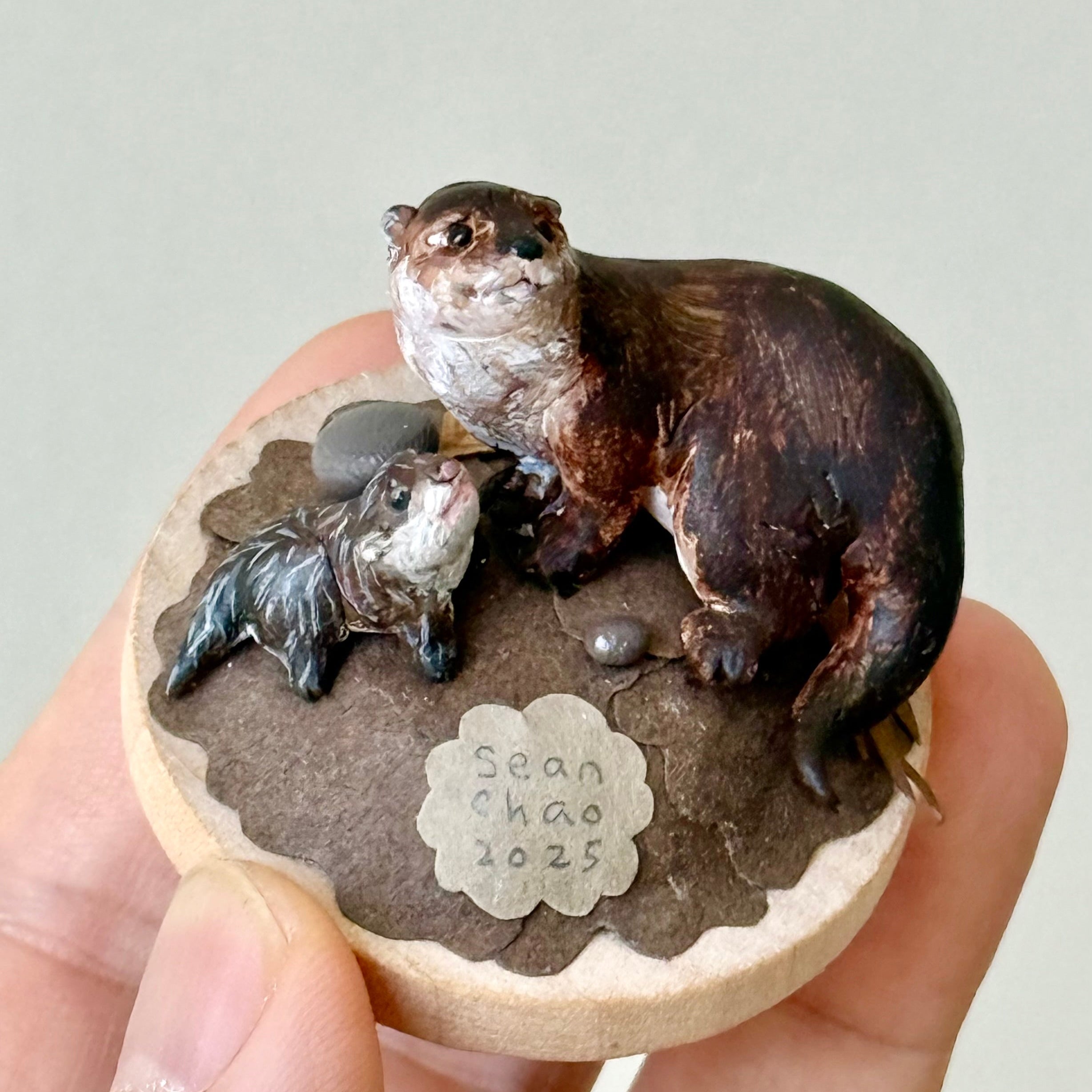 Polymer clay, paper, acrylic paint and wooden disc base.