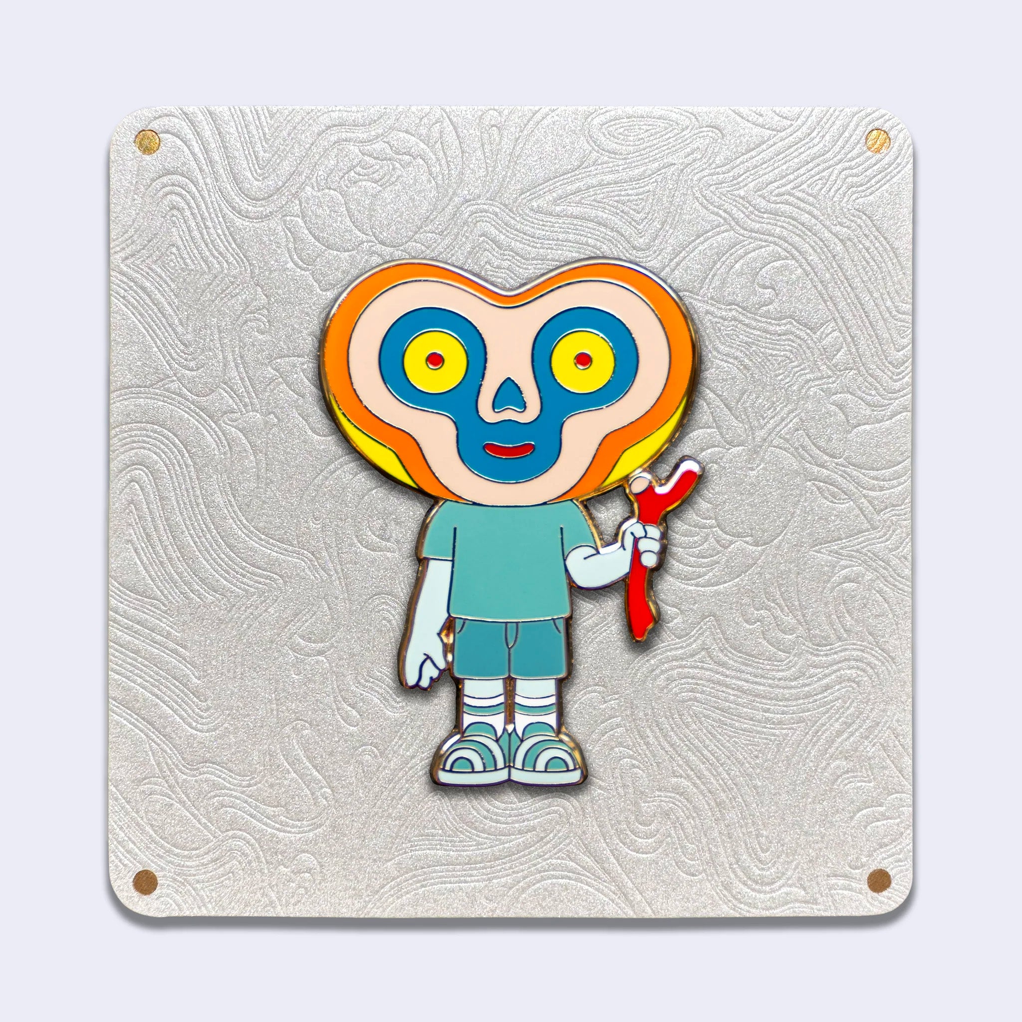 Trespassers is a collaborative project between James Jean and Haroshi, representing their friendship and shared impulse to venture into places where they do not belong. This pin features a new character that has the head of a GUZO and the body of a Descendent in nine enamel colors.