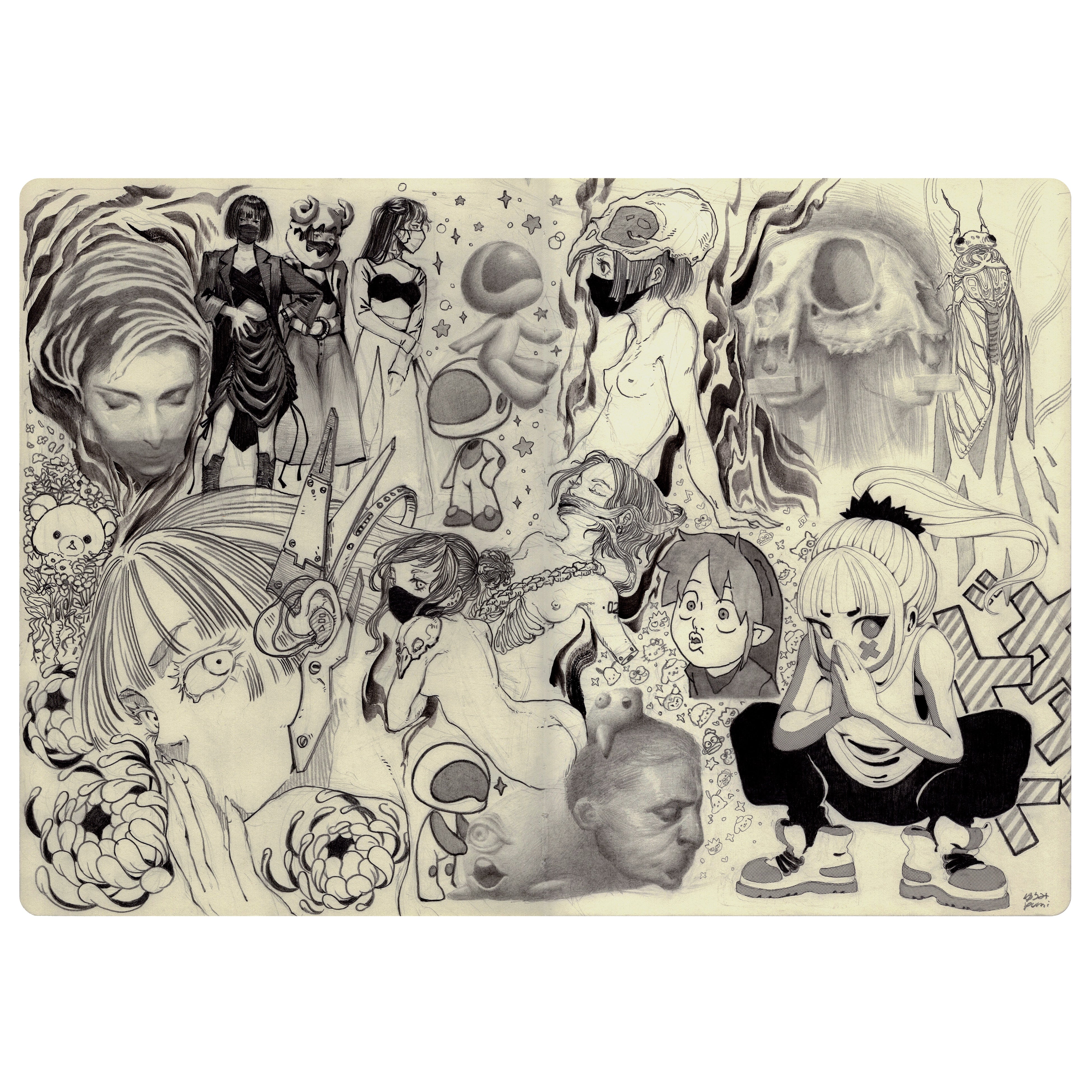 Graphite, screentone and mixed media on moleskine. Piece is framed.