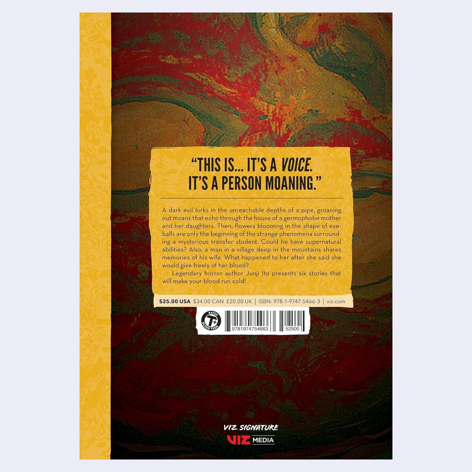 A dark evil lurks in the unreachable depths of a pipe, groaning out moans that echo through the house of a germophobe mother and her daughters. In another tale, flowers blooming in the shape of eyeballs are only the beginning of the strange phenomena surrounding a mysterious transfer student. Could he have supernatural abilities? Also, a man in a village deep in the mountains shares memories of his wife. What happened to her after she said she would give freely of her blood?