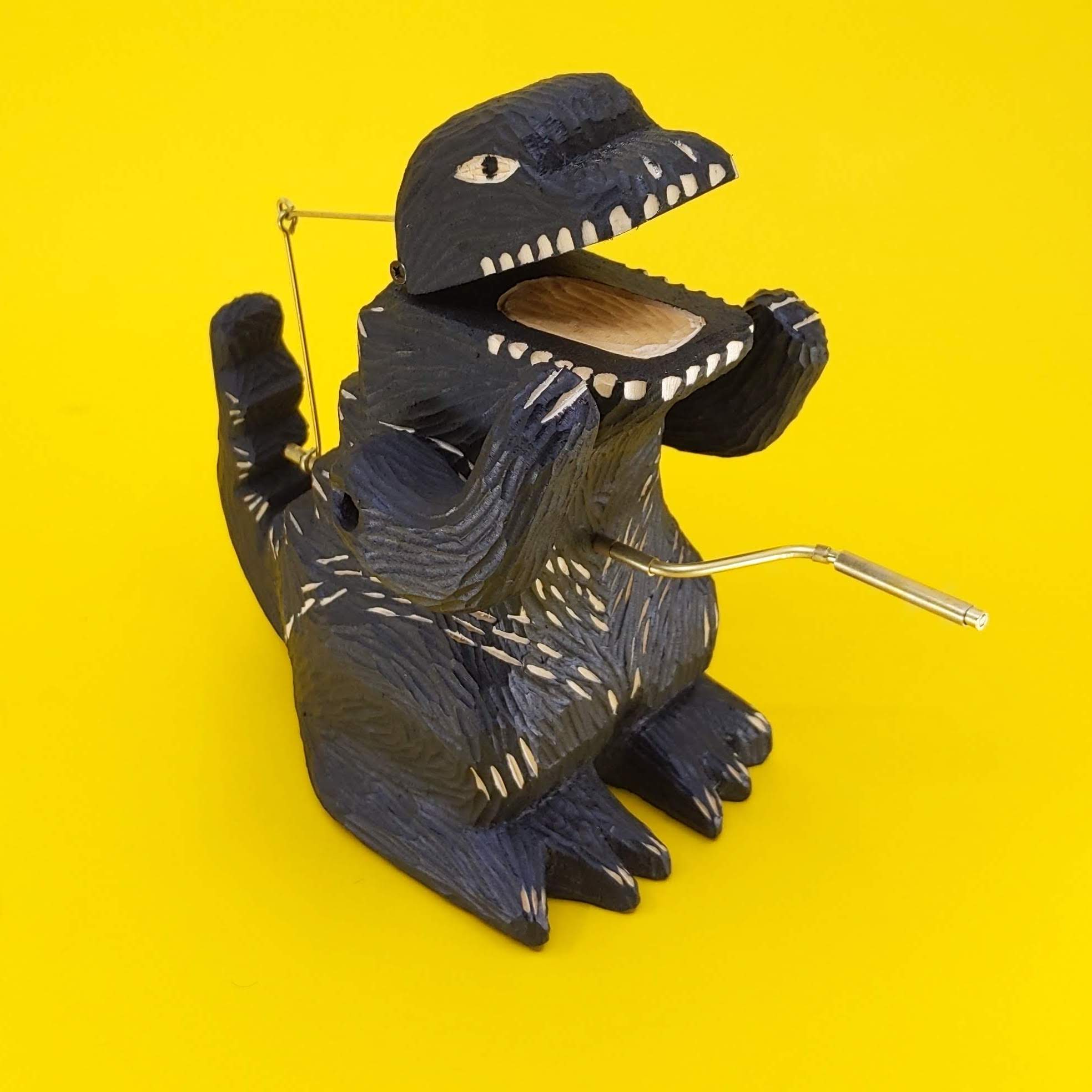 Mouth opens and closes when crank is in use, arms can be manually moved up and down.