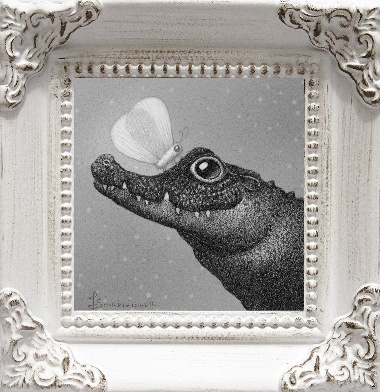 A finely detailed illustration of a semi-cartoonish crocodile, smiling kindly up at a large moth on its snout. Illustration is greyscale and maintains a slightly fuzzy visual feature and is in an ornate white wooden frame.
