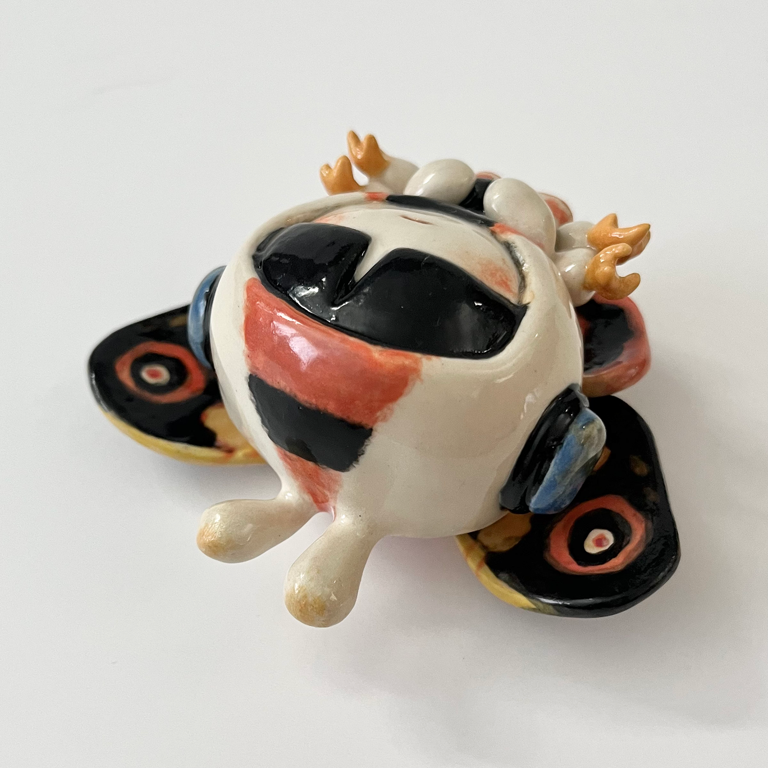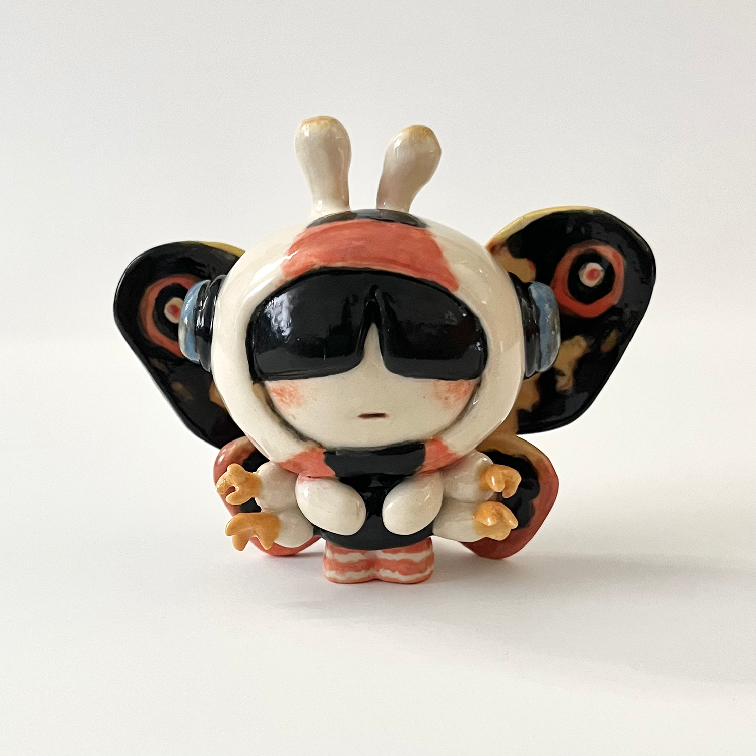 Ceramic sculpture of a small character with a large head wearing a Mothra costume, with a hood hat and a large set of wings behind it matching Mothra's colorways.