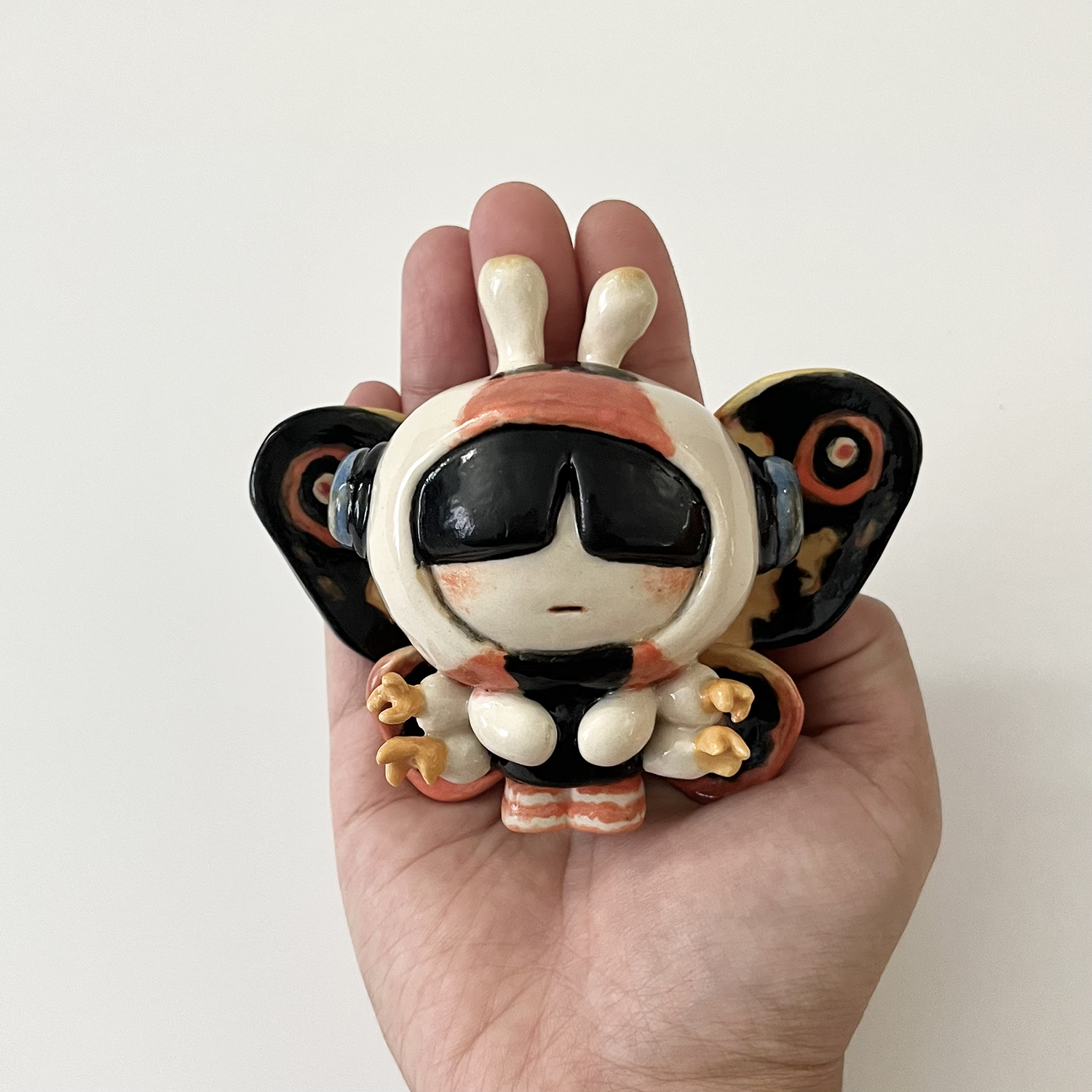 Ceramic sculpture of a small character with a large head wearing a Mothra costume, with a hood hat and a large set of wings behind it matching Mothra's colorways. Its being held in someone's hand.