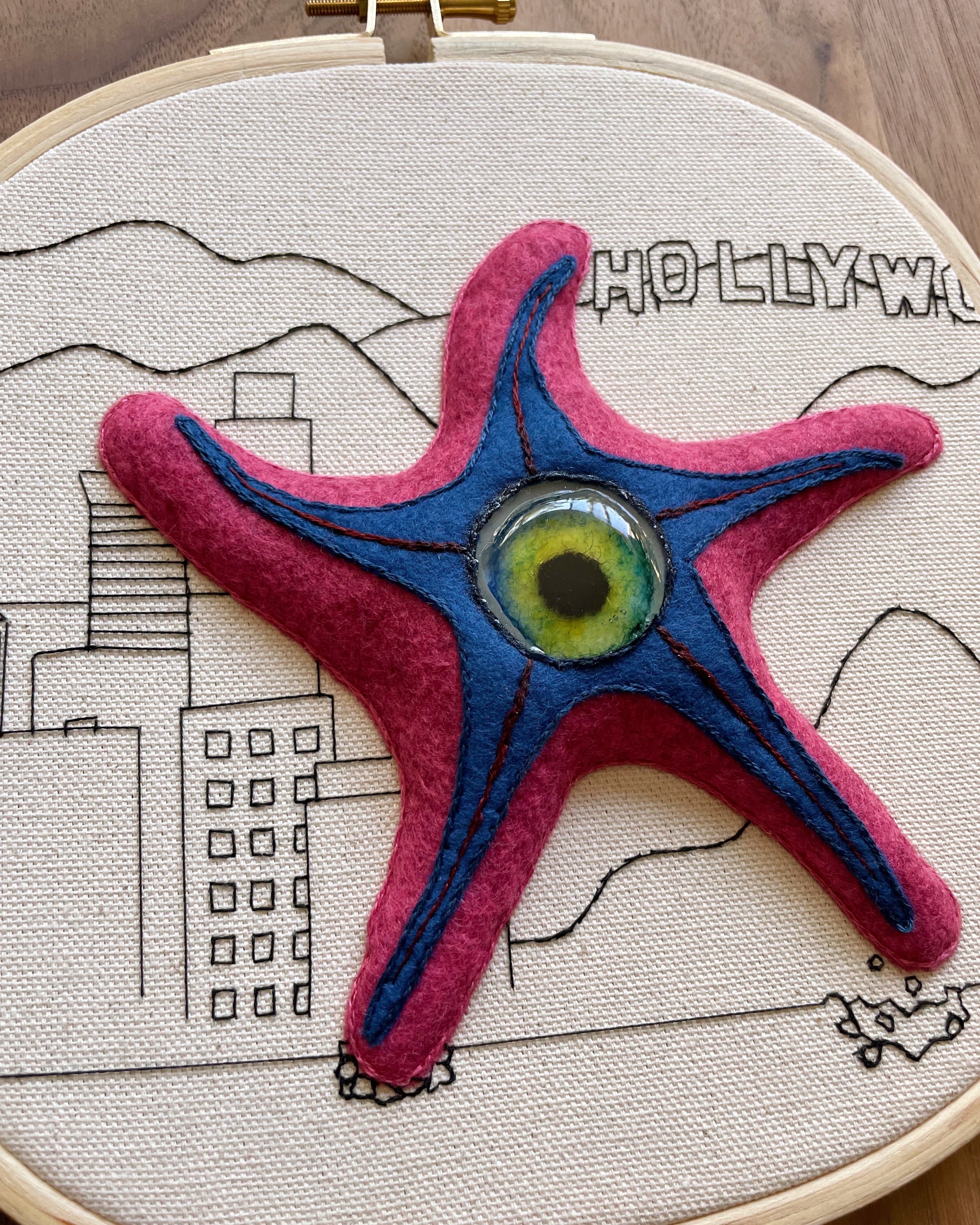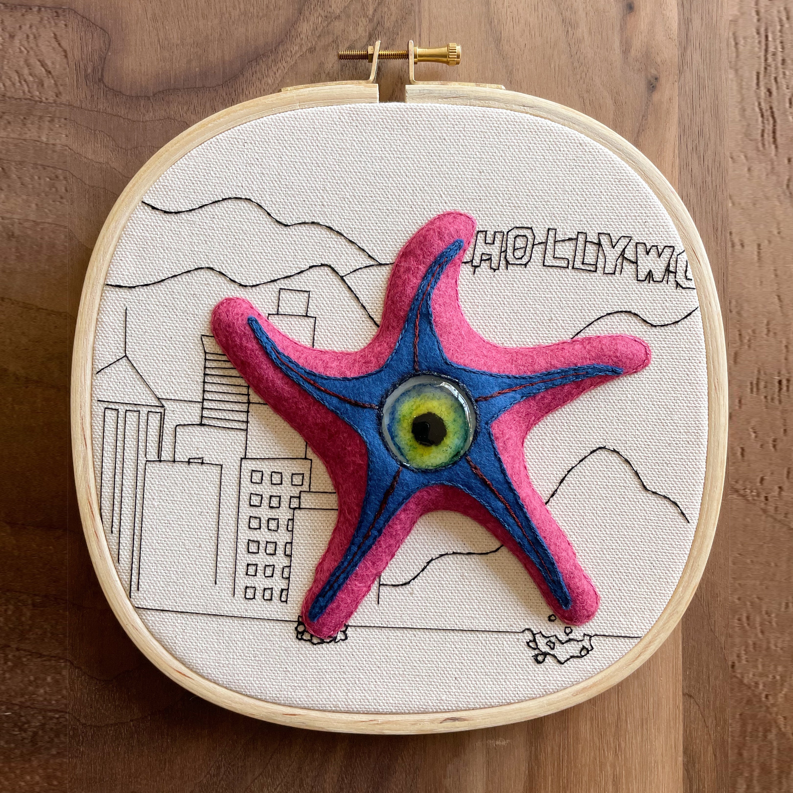 Felt, wool, canvas, thread, resin. Piece is framed in wooden embroidery hoop.