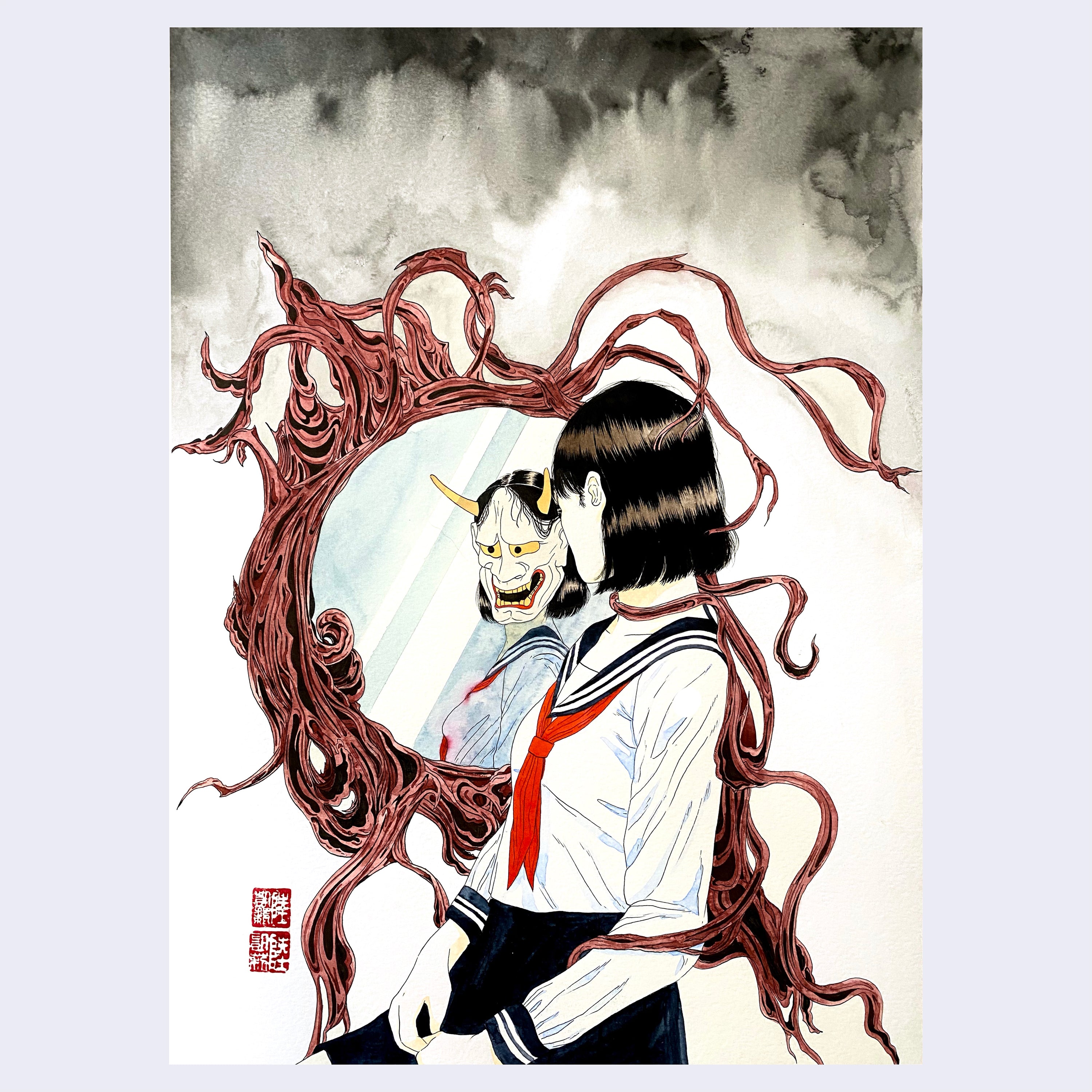 Watercolor, ballpoint pen, copic, and ink on heavyweight watercolor paper. Piece is framed.