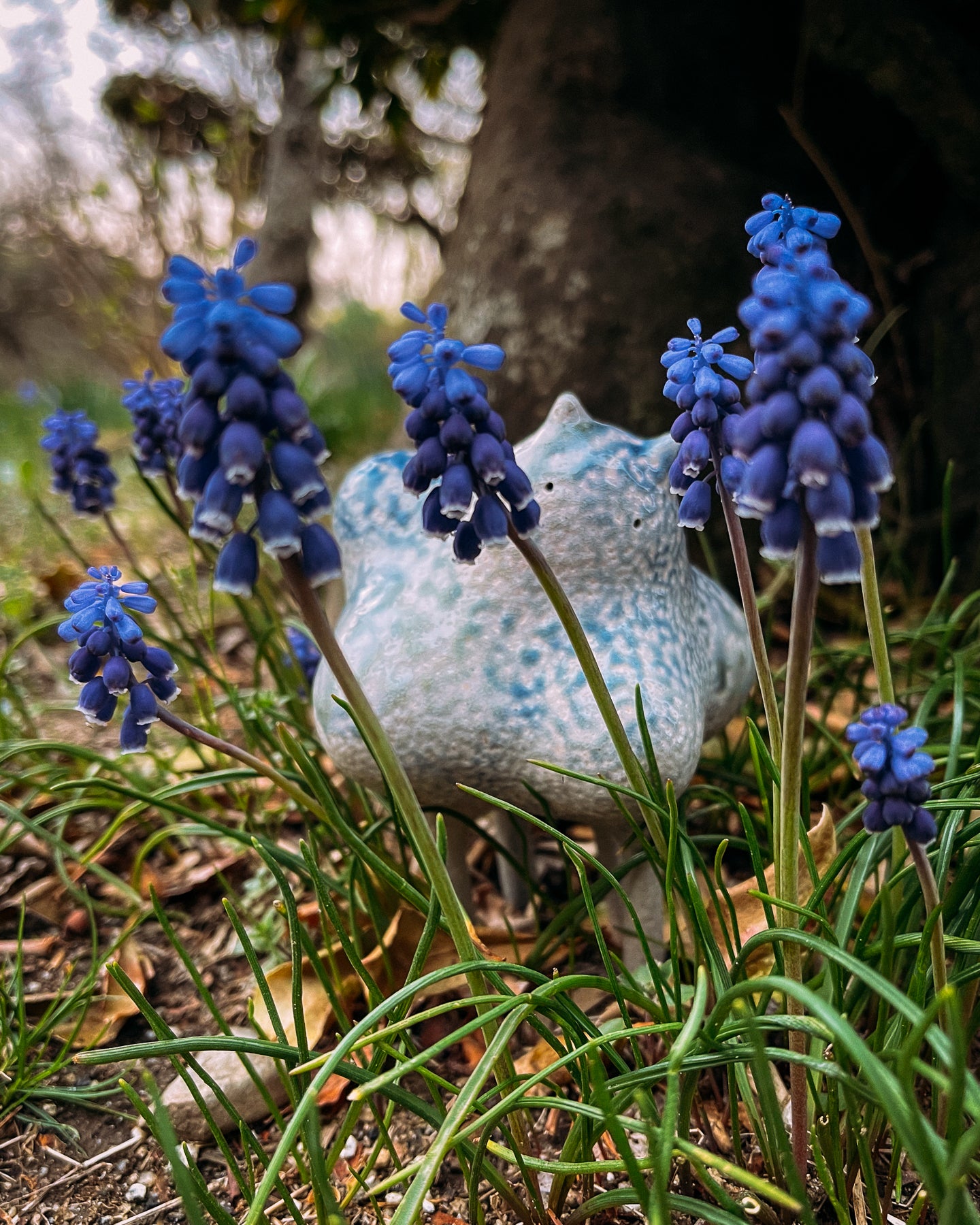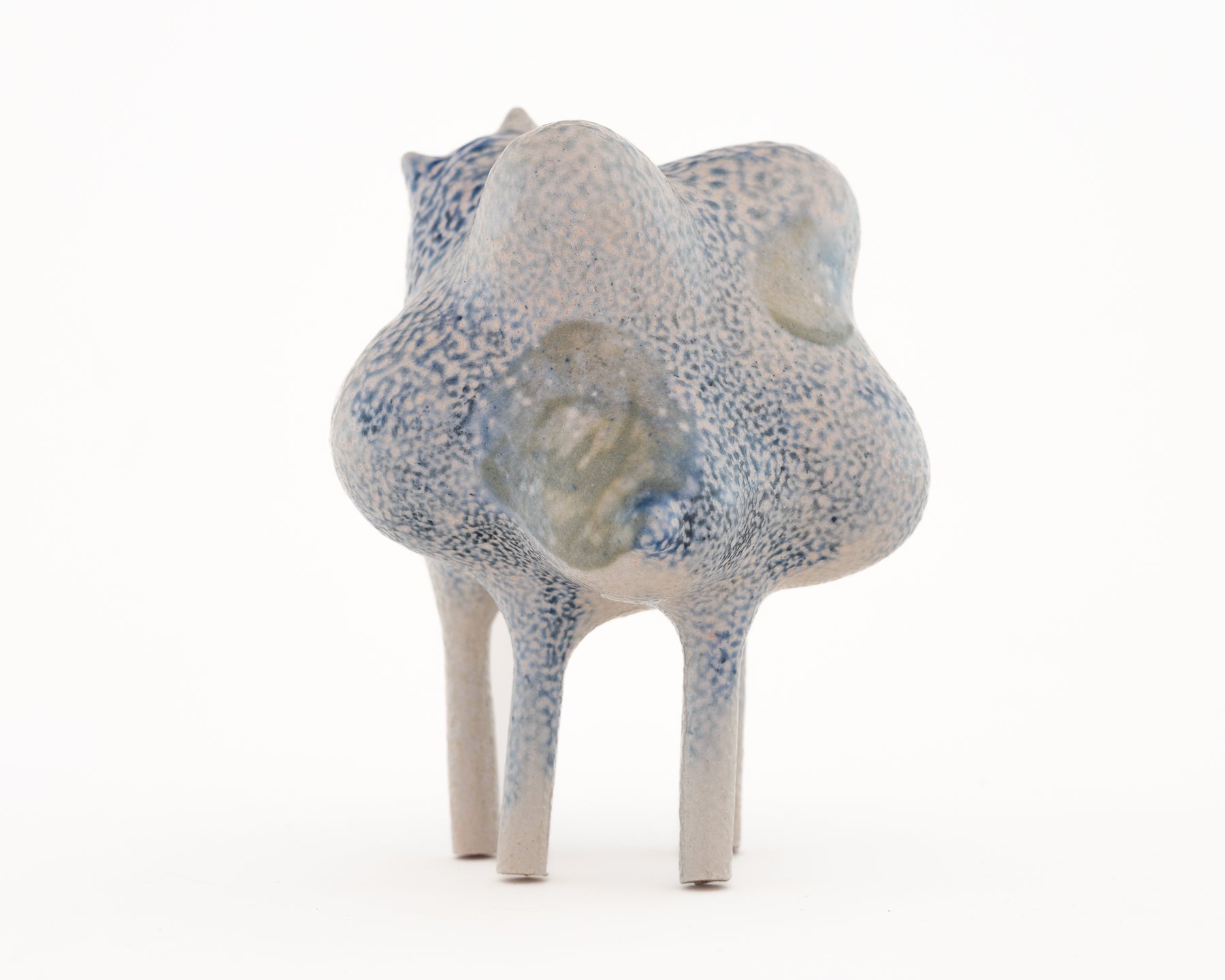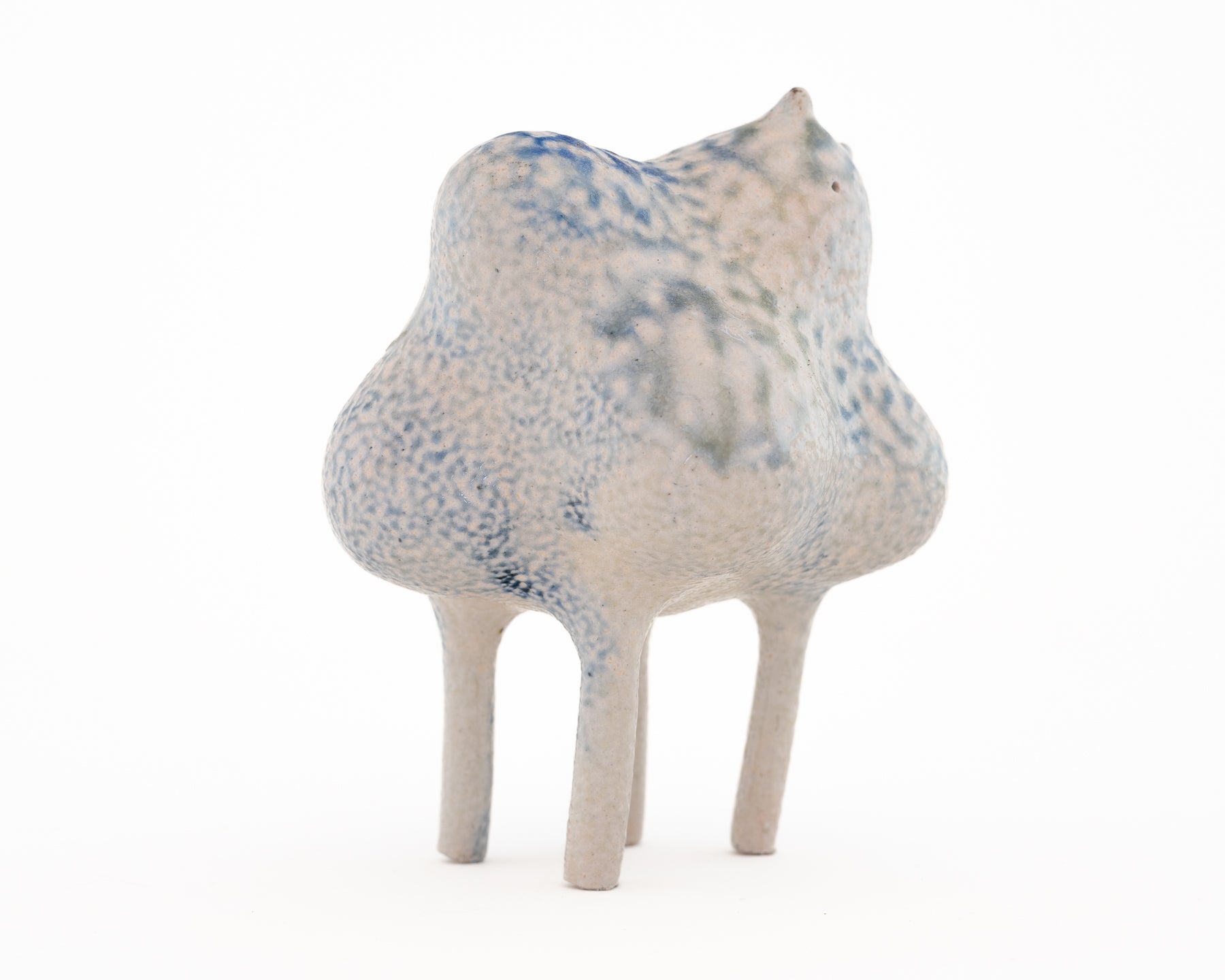 Ceramic sculpture of a character with a lumpy spotted body, tall thin legs, and small eyes and ears.