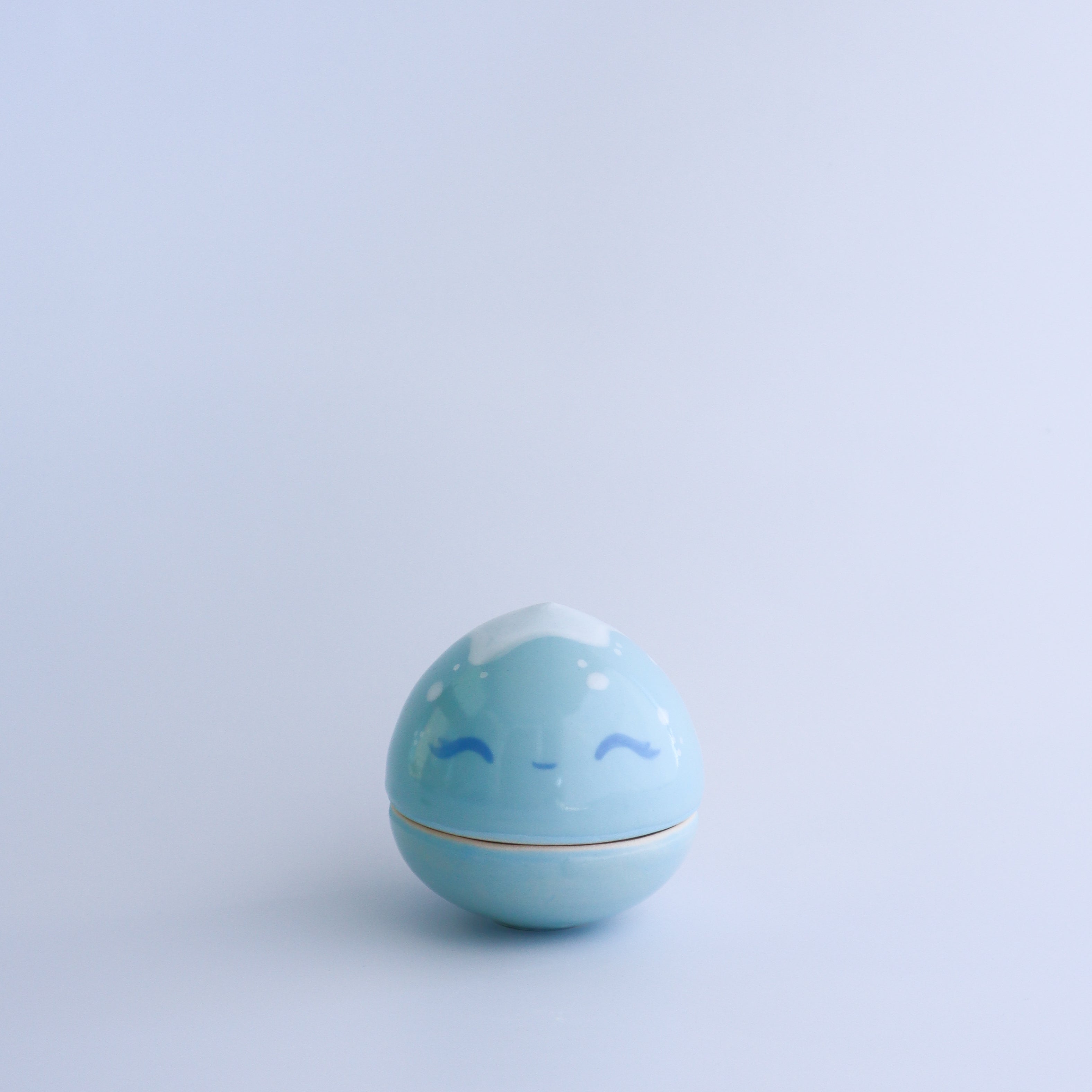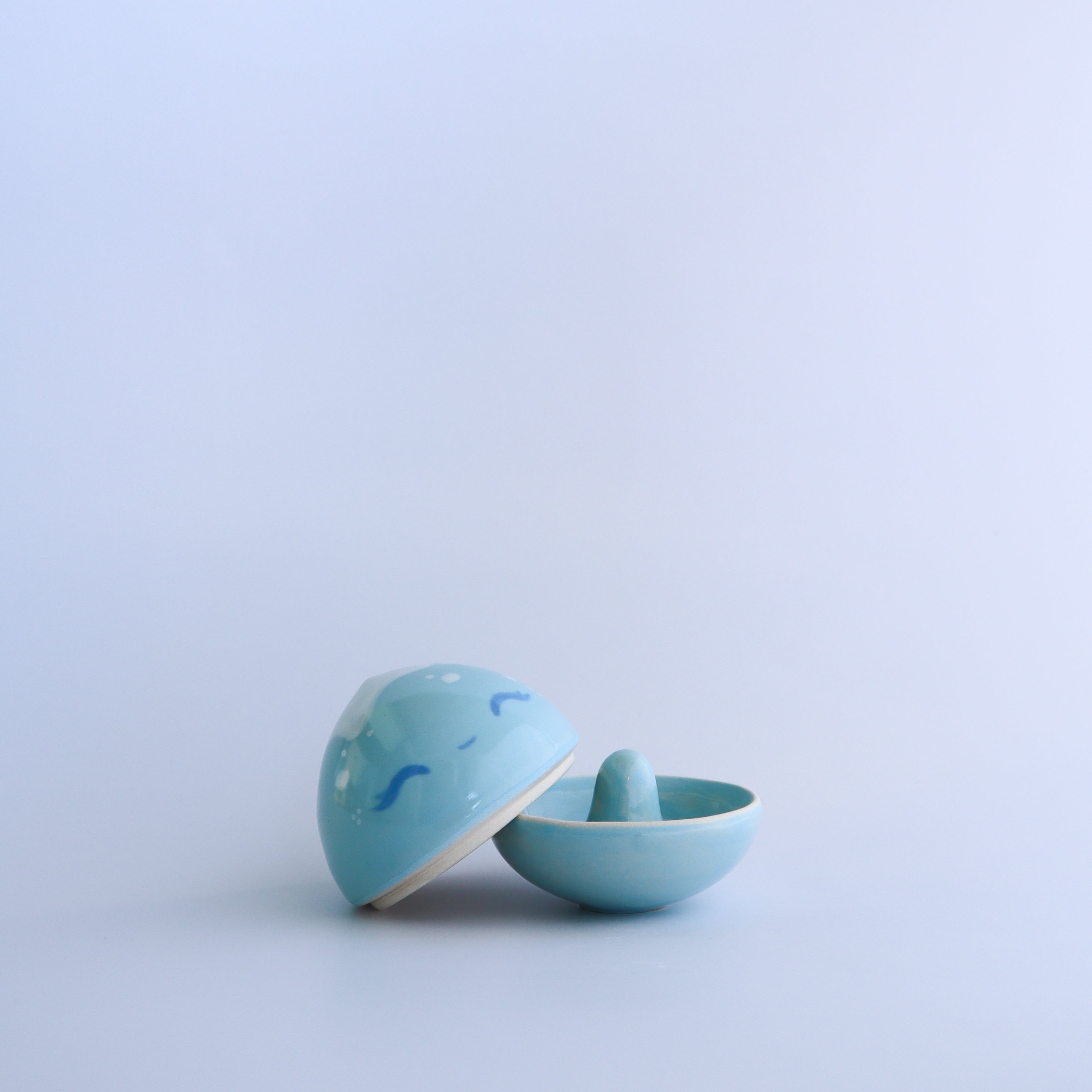 Slipcast and trimmed with hand built attachments. Underglazed and dipped in a clear non toxic glaze.