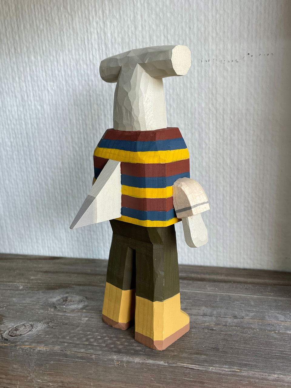 Sculpture made out of whittled wood and partially painted of a hammerhead shark wearing a striped shirt, pants and boots. The center of its body is very blocky.