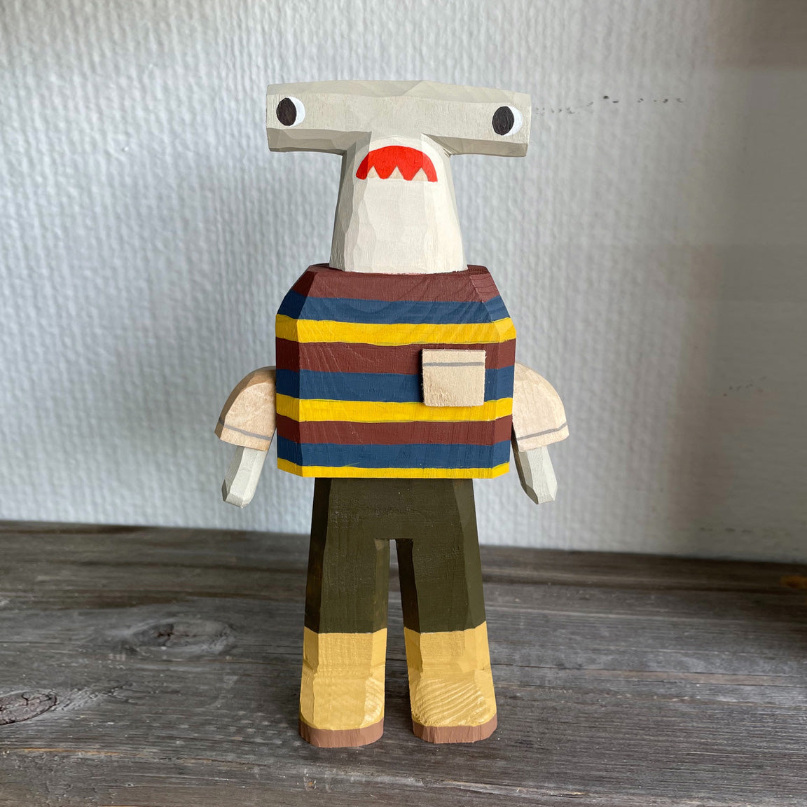 Sculpture made out of whittled wood and partially painted of a hammerhead shark wearing a striped shirt, pants and boots. The center of its body is very blocky and it has a pointed fin on its back.