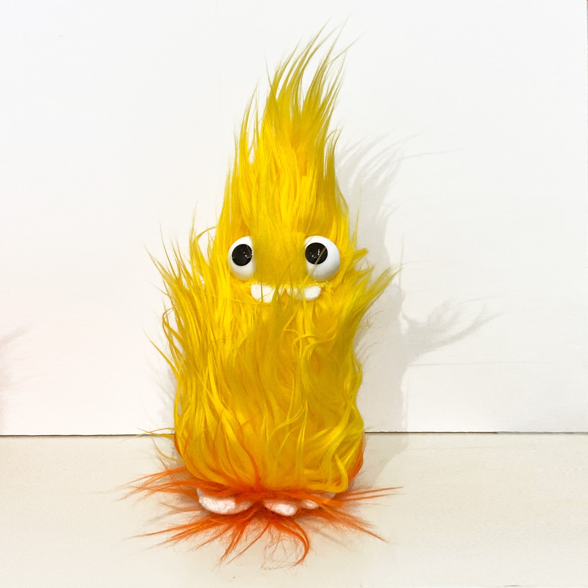 Cinder is made with long faux fur, felt details, vintage plastic eyes, polyfil, and weighted beads.