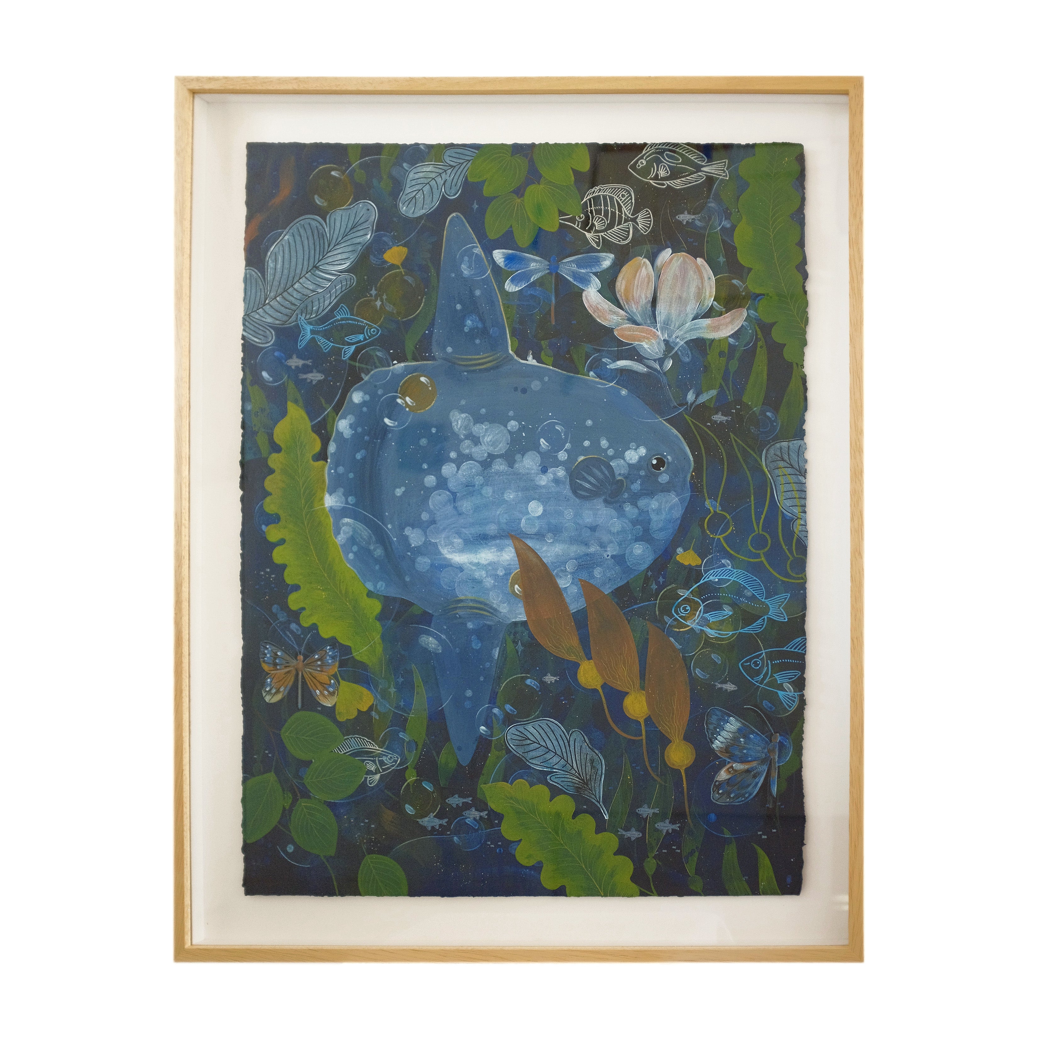 Painting of a large blue sunfish on dark blue background with various ocean themed drawings around it like a collage. Elements include: fish, bubbles, kelp and sea greenery. Piece is in a thin wooden frame.