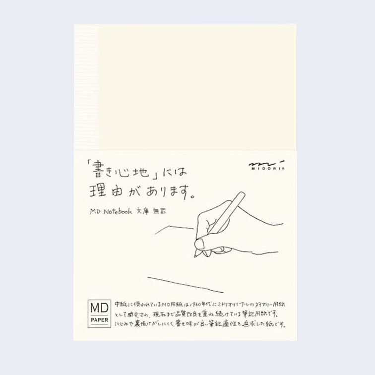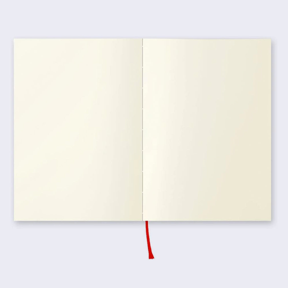 Such a classic look for this Midori bound notebook. The notebook has a sturdy thread binding that lies flat when open, making it easy to write. It also comes with a ribbon marker to keep your place. The cover is not a typical notebook cover. To feature the charm of the paper itself, the cloth tape used to bind the spine, usually hidden by a cover, is exposed, giving the notebook a unique look. You can even see where the ribbon marker is glued in place. The notebook also comes with sticker labels that can be used to label the notebook.