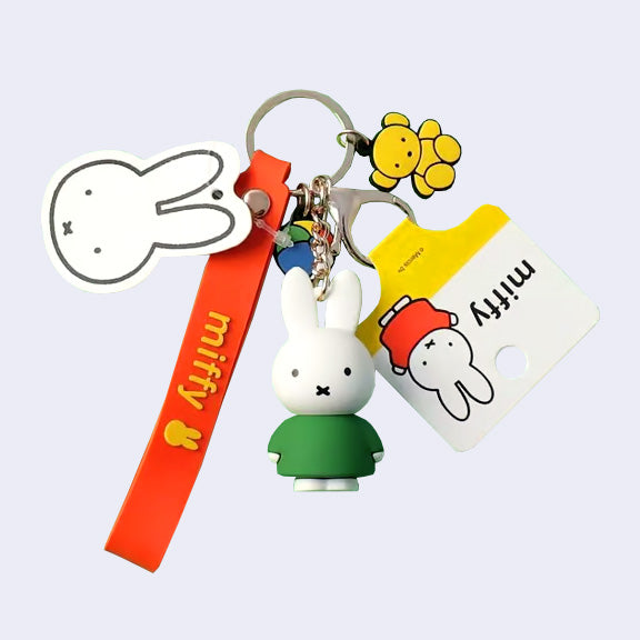 What better way to jazz up a set of keys or bag than with this adorable multi-figure rubber keychain! Features 4 different components in addition to a lobster clasp and keychain: Miffy figure, Miffy strap, flat mini ball and flat mini teddy bear. Perfect for your backpack, purse or bag.