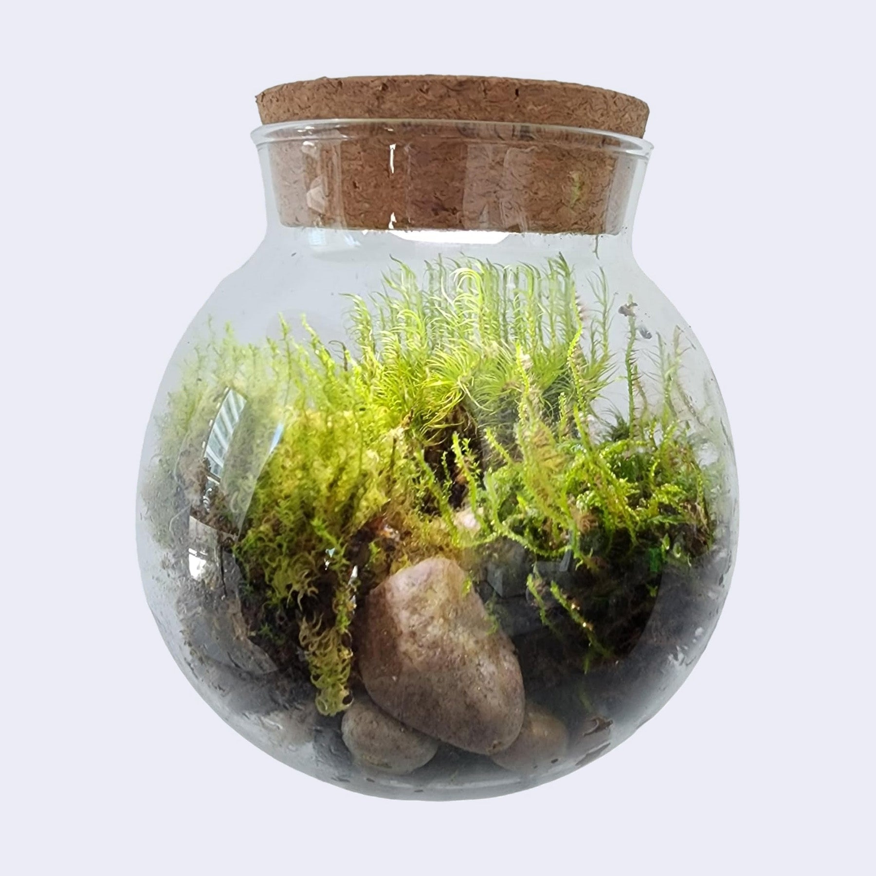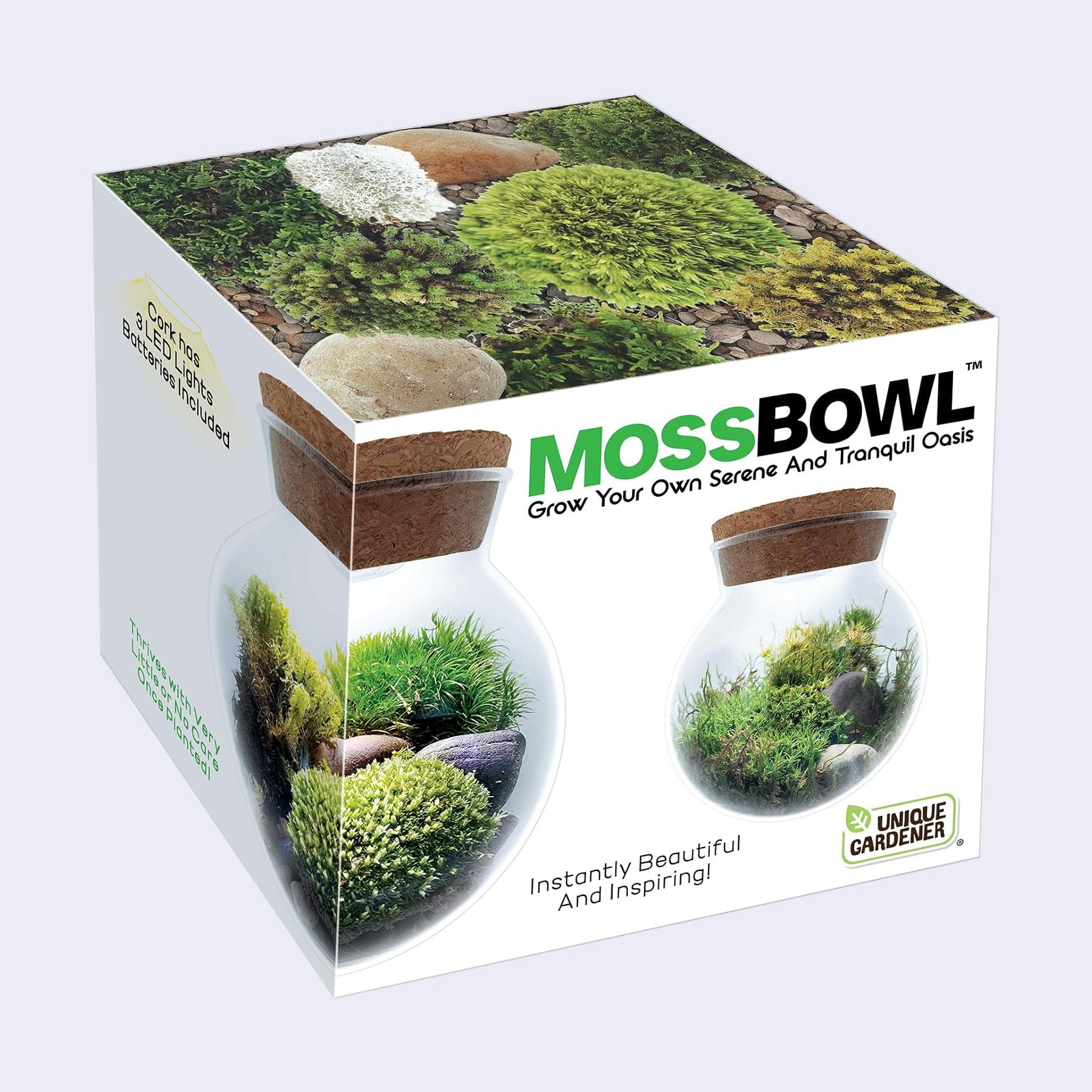 Create your own unique and vibrant Aquascape. Grow a tranquil moss garden with this handy kit. The terrarium kit features 3 kinds of different mosses - Sheet Moss, Sun Moss, & Deerfoot Moss. Discover the ancient wonders of mosses, dating back over 450 million years, resilient to diverse environments. Its crystal-clear glass terrarium provides an unobstructed view of your flourishing plants, making it the centerpiece of conversations. The cork contains three bright LED accent lights to illuminate your creation.