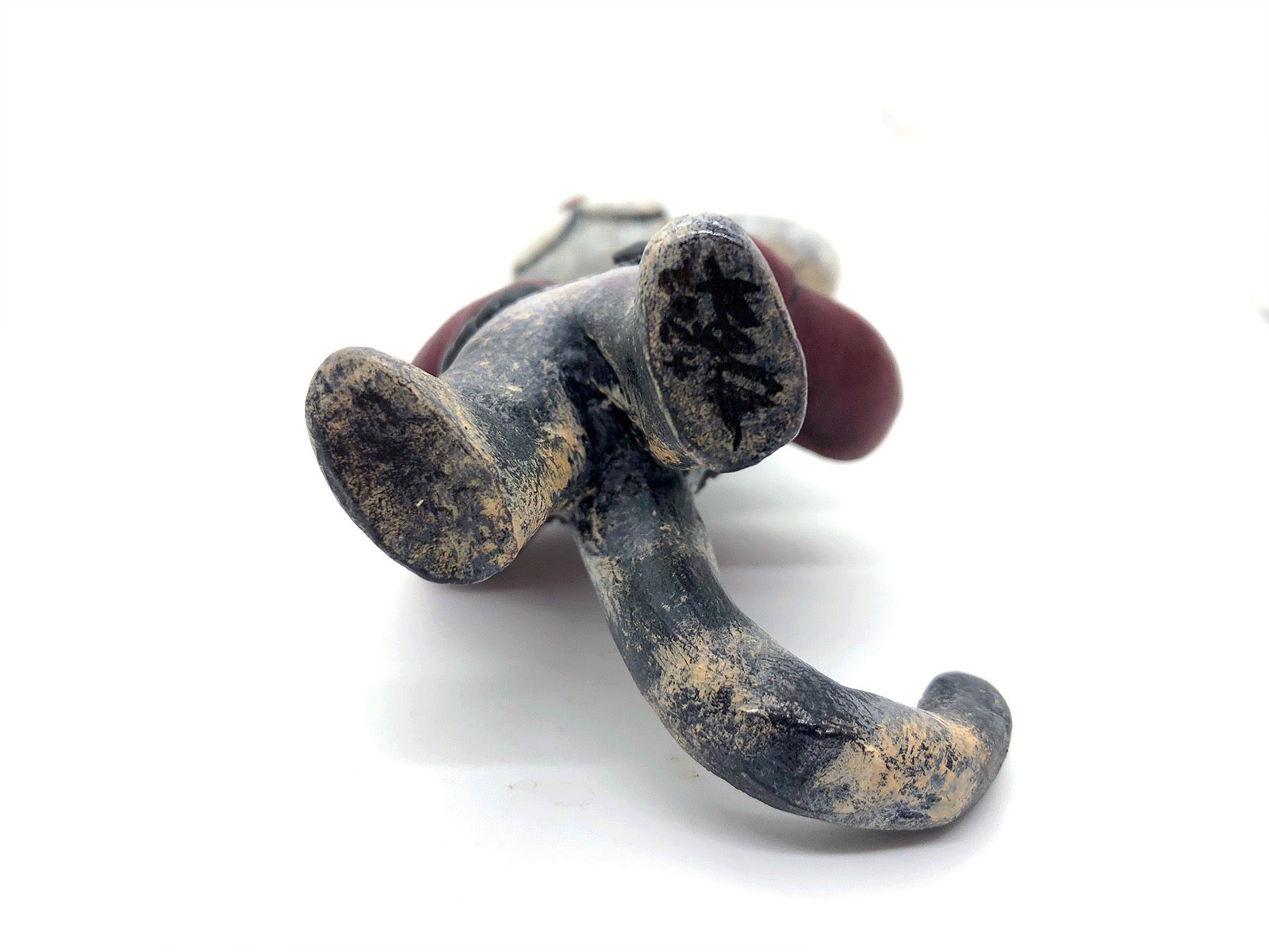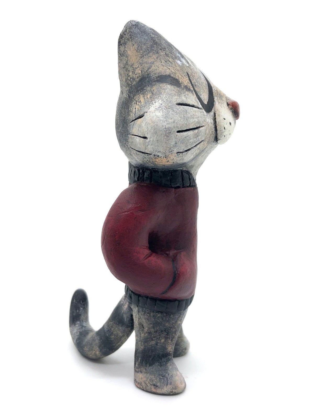 Sculpture of a cartoon gray cat, with closed eyes and a calm expression. It stands like a human and wears a burgundy jacket with its hands in its pockets.