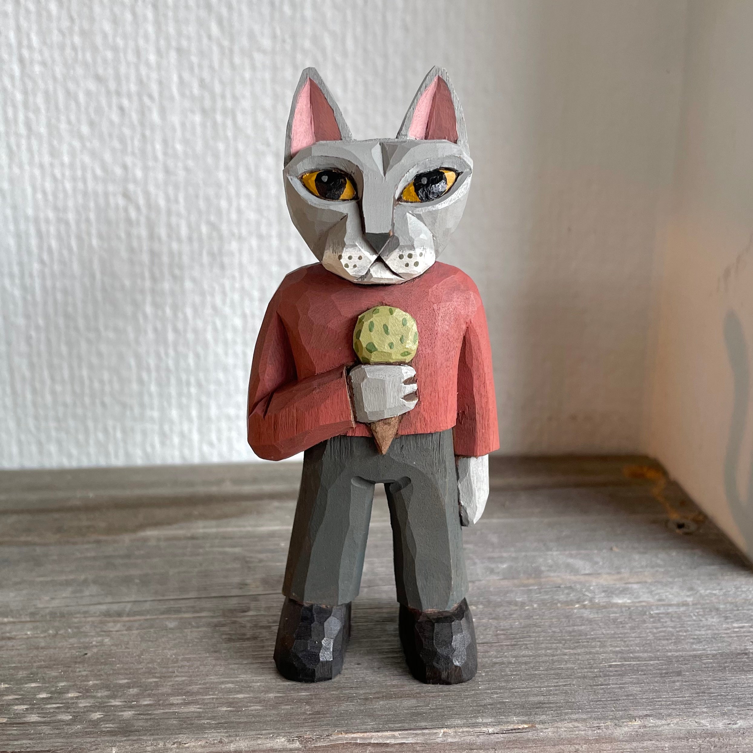 Whittled wooden sculpture of a surly looking gray cat with yellow eyes, standing on two legs like a human. They are dressed in a red long sleeve and gray slacks with black boots and hold an ice cream cone with a scoop of green ice cream.