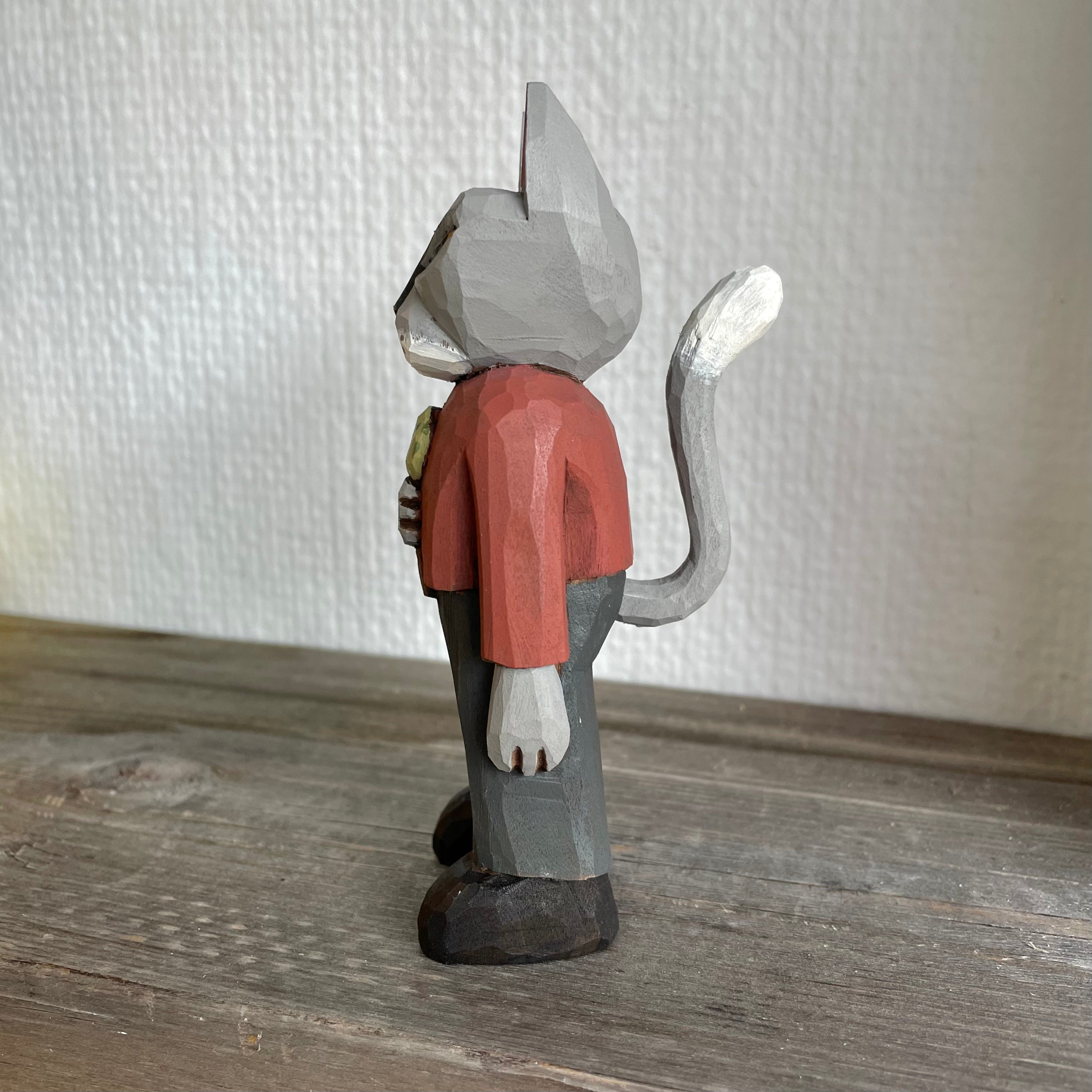 Whittled wooden sculpture of a surly looking gray cat with yellow eyes, standing on two legs like a human. They are dressed in a red long sleeve and gray slacks with black boots and hold an ice cream cone with a scoop of green ice cream. It has an upright, long tail.