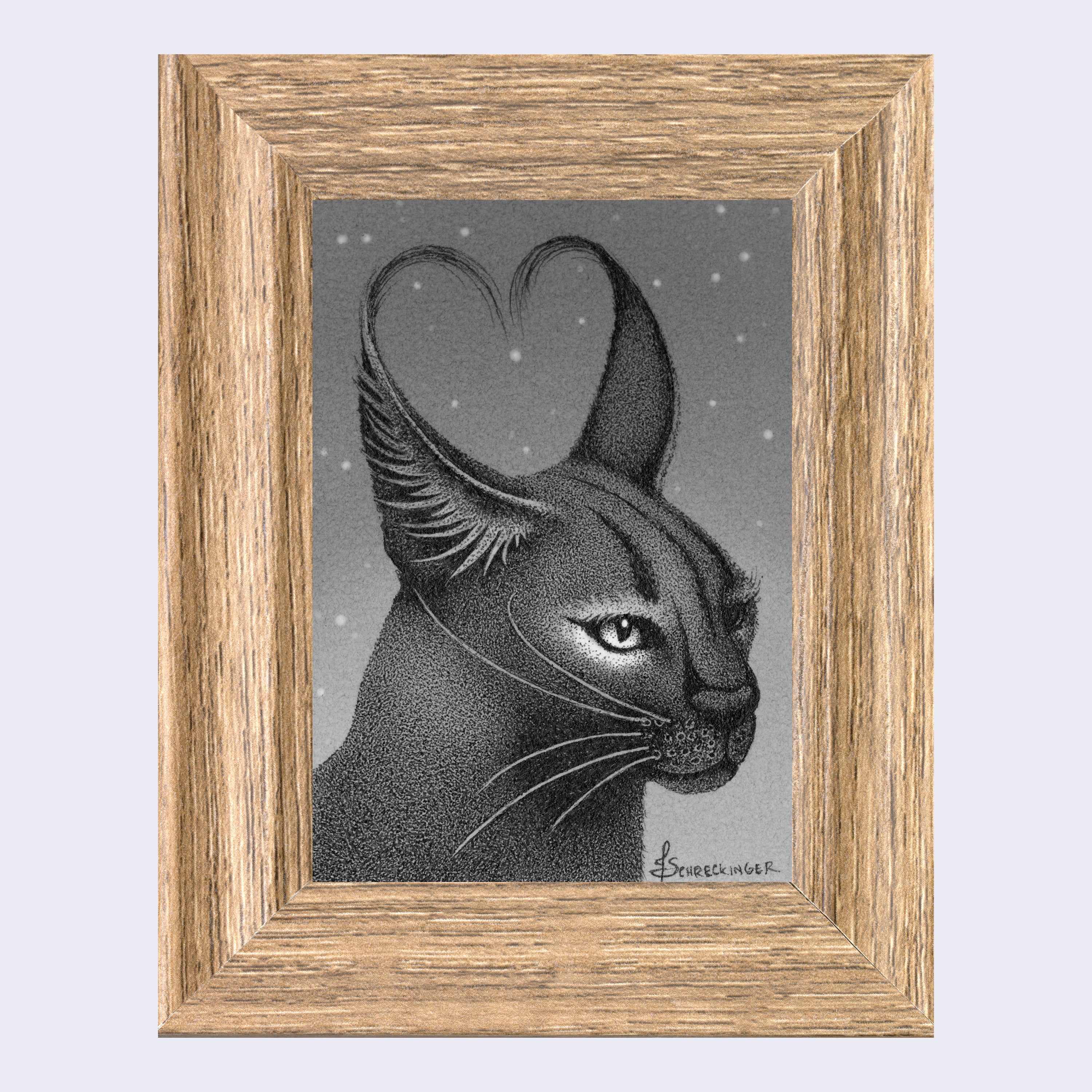 Finely rendered greyscale pen and ink drawing of a caracal, a wild cat with tall wispy ears.  It looks slightly off to the right and its two ears come together barely to form a heart. Piece is in a lighter colored thick wooden frame.
