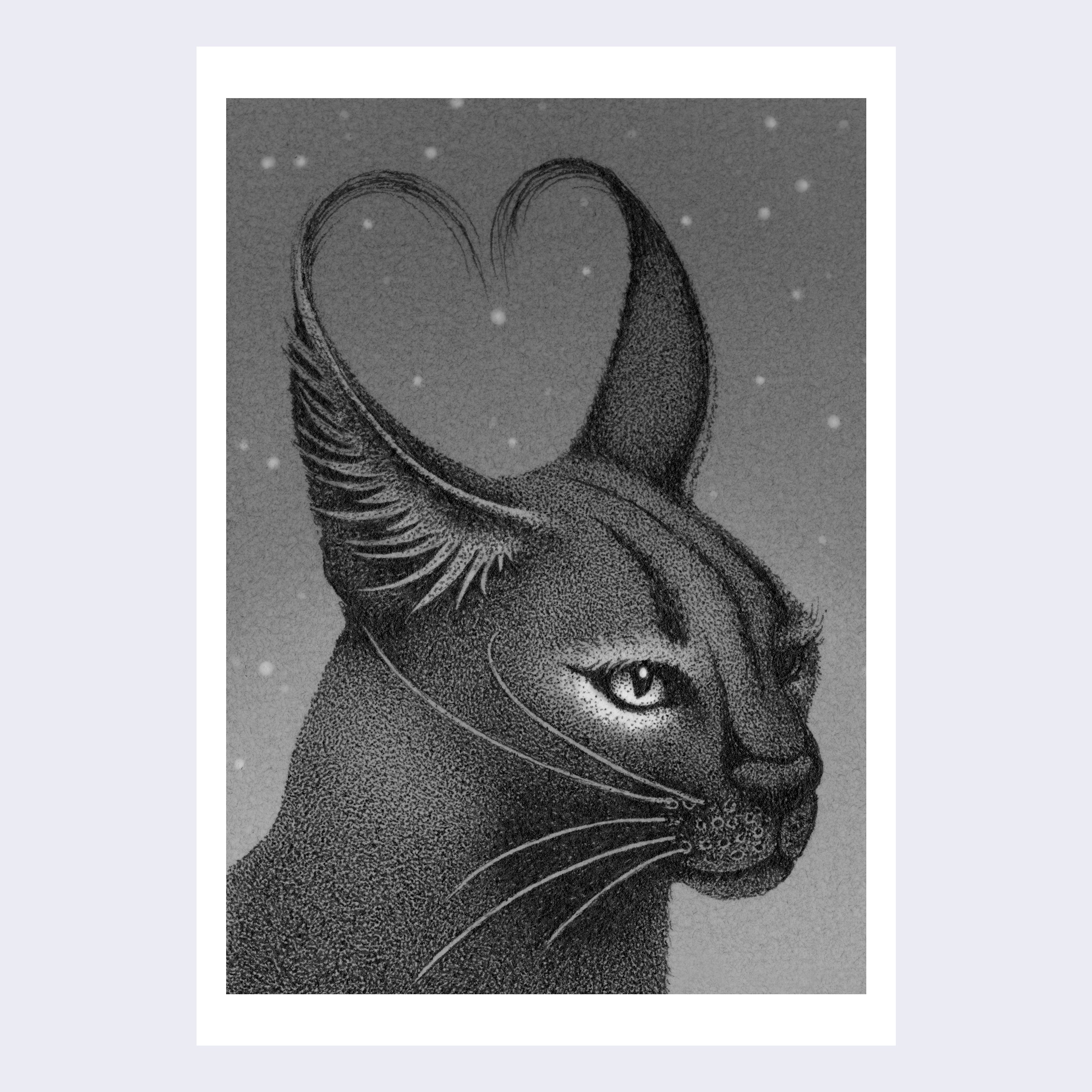 Finely rendered greyscale pen and ink drawing of a caracal, a wild cat with tall wispy ears. It looks slightly off to the right and its two ears come together barely to form a heart.