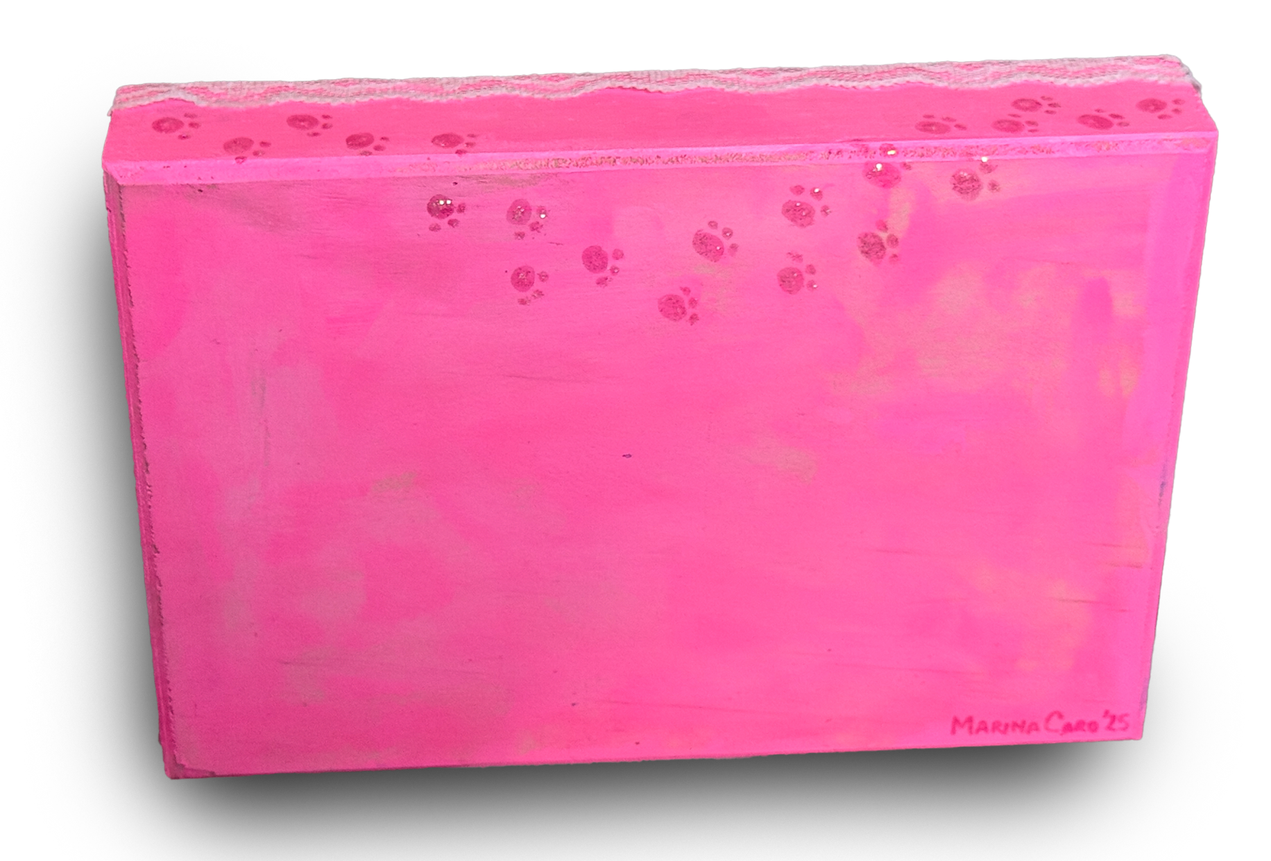 Mixed media assemblage on wood with acrylic paints, glitter, found doll accessories, modeling foam, lace, and ribbon.