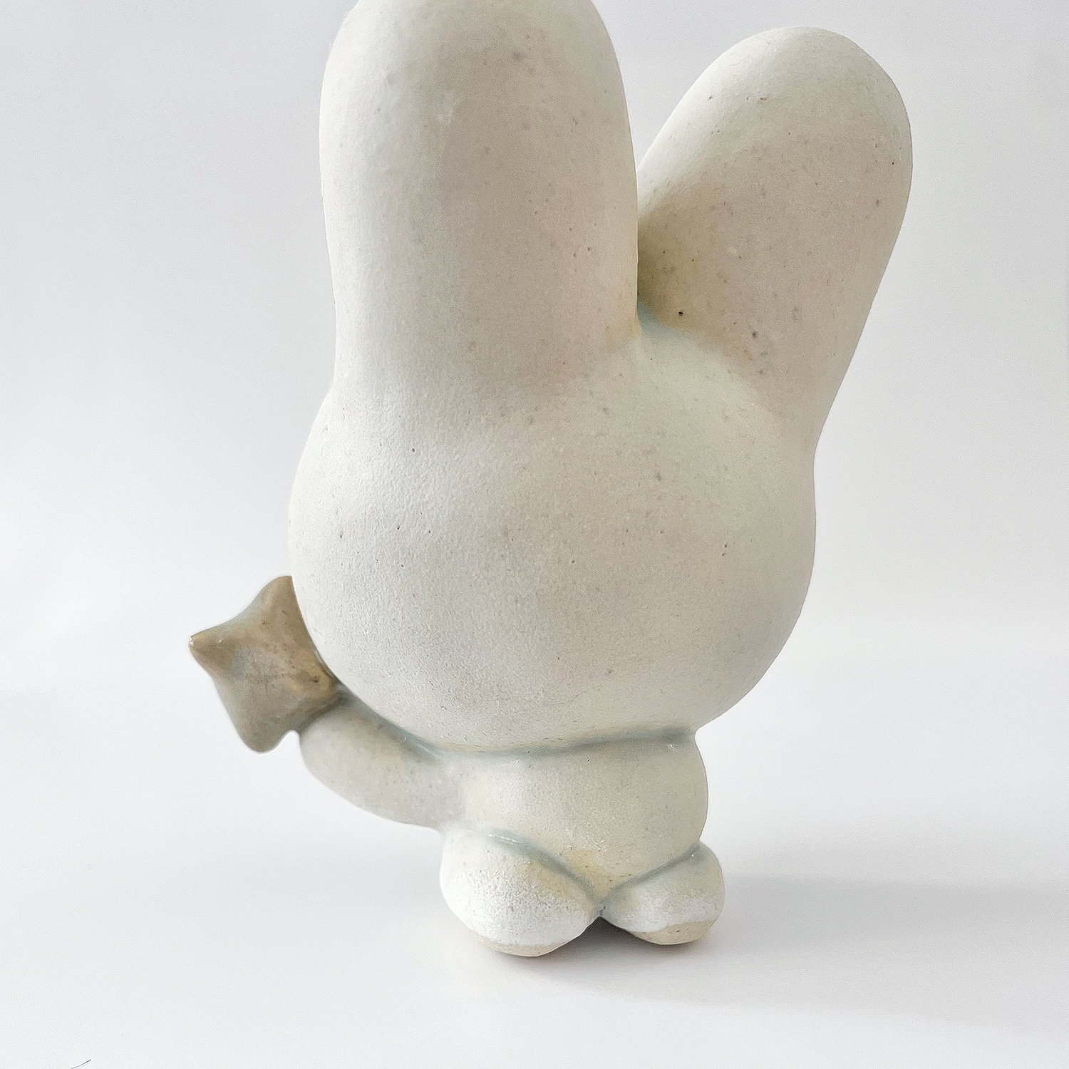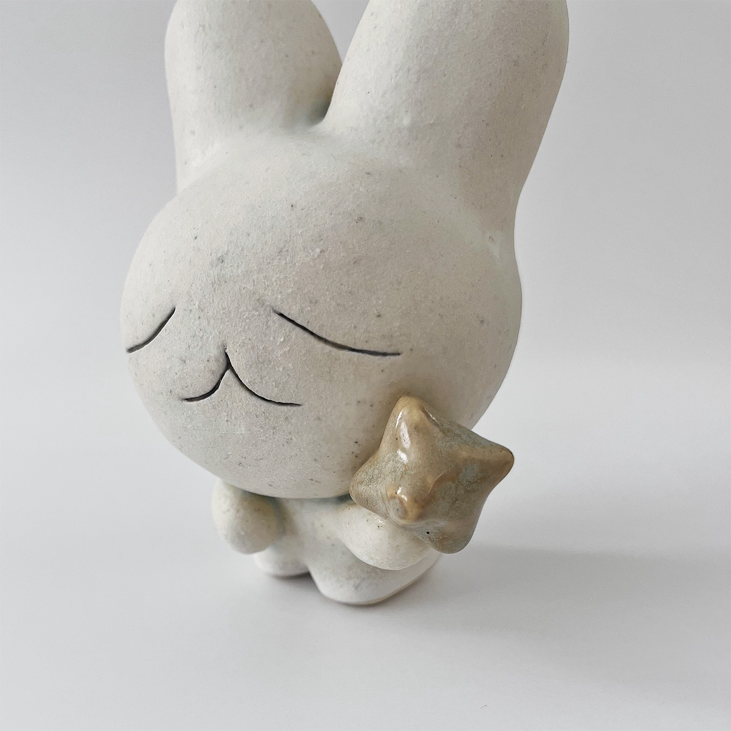Small white ceramic sculpture of a bunny character with a calm, closed eye expression. It has a large head and a tiny body, holding a star.