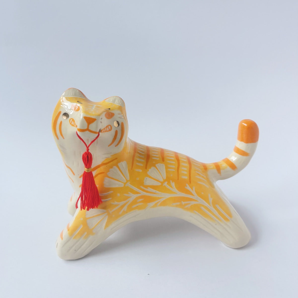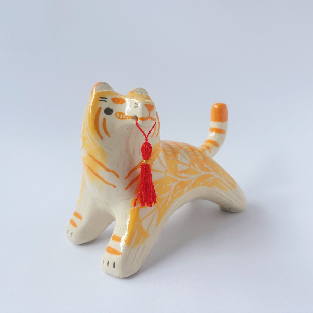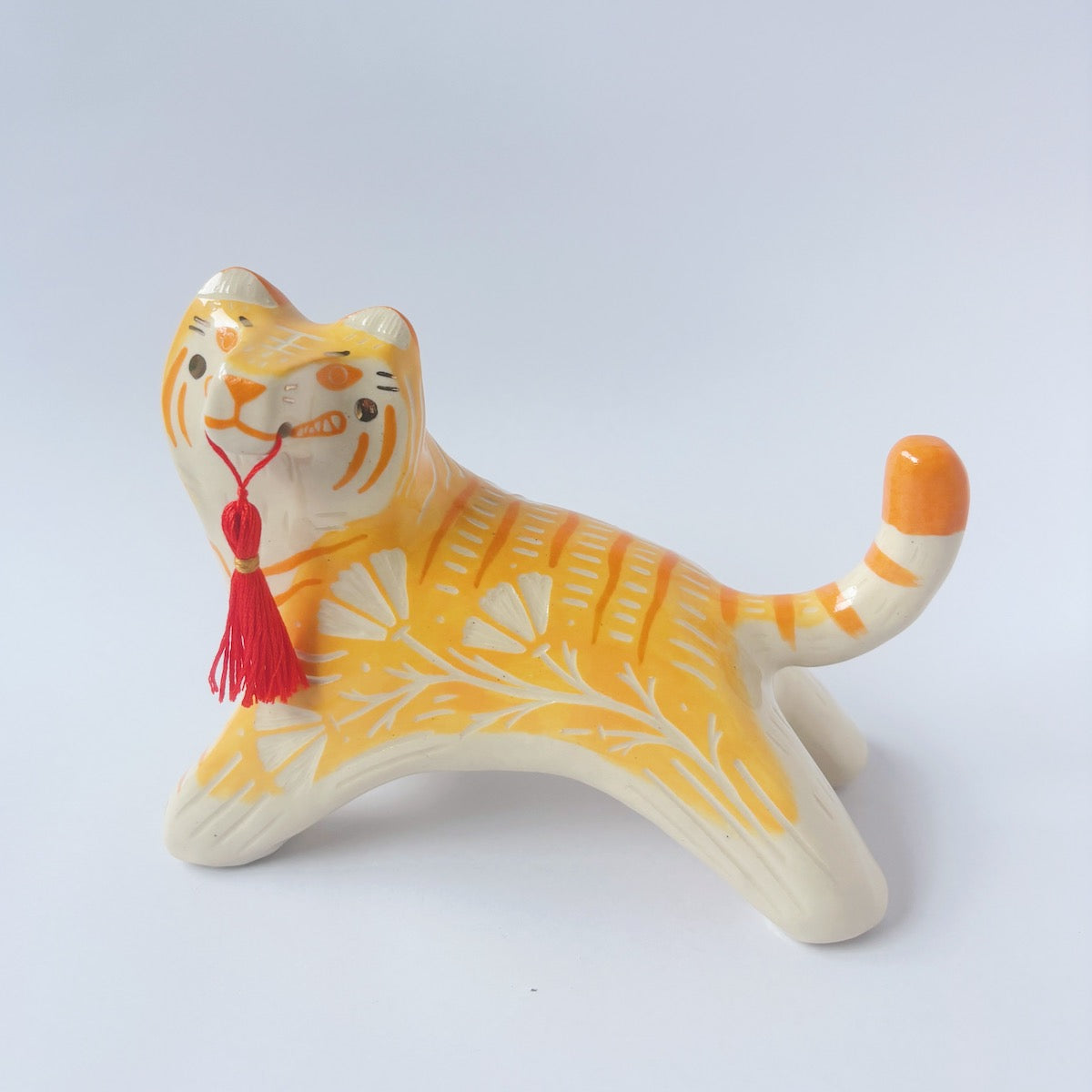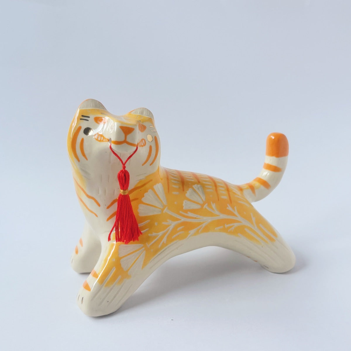 Glossy ceramic sculpture of an orange and white tiger with gold detailing, holding a red fabric tassel in its mouth.