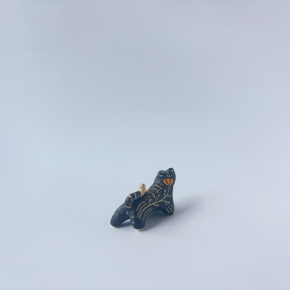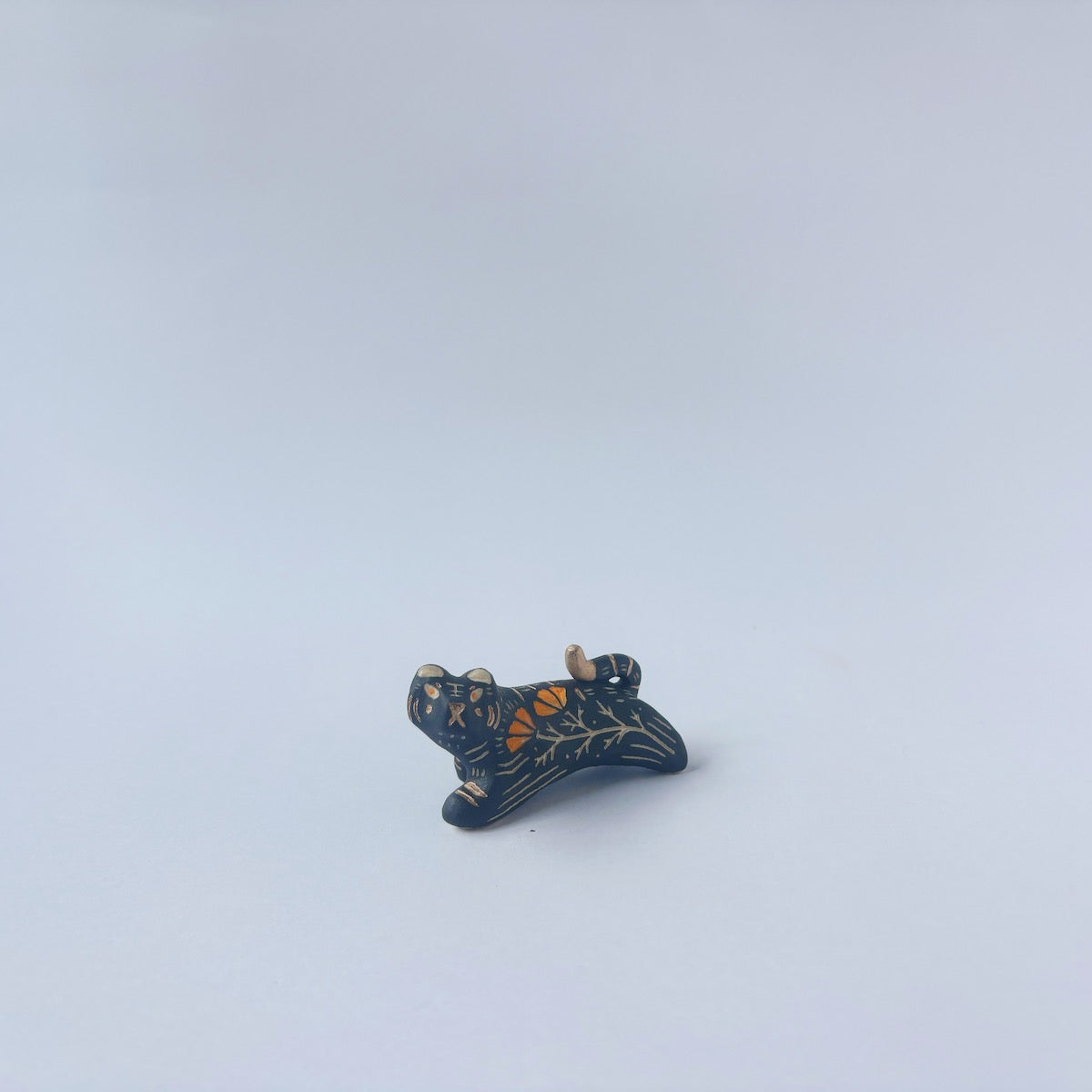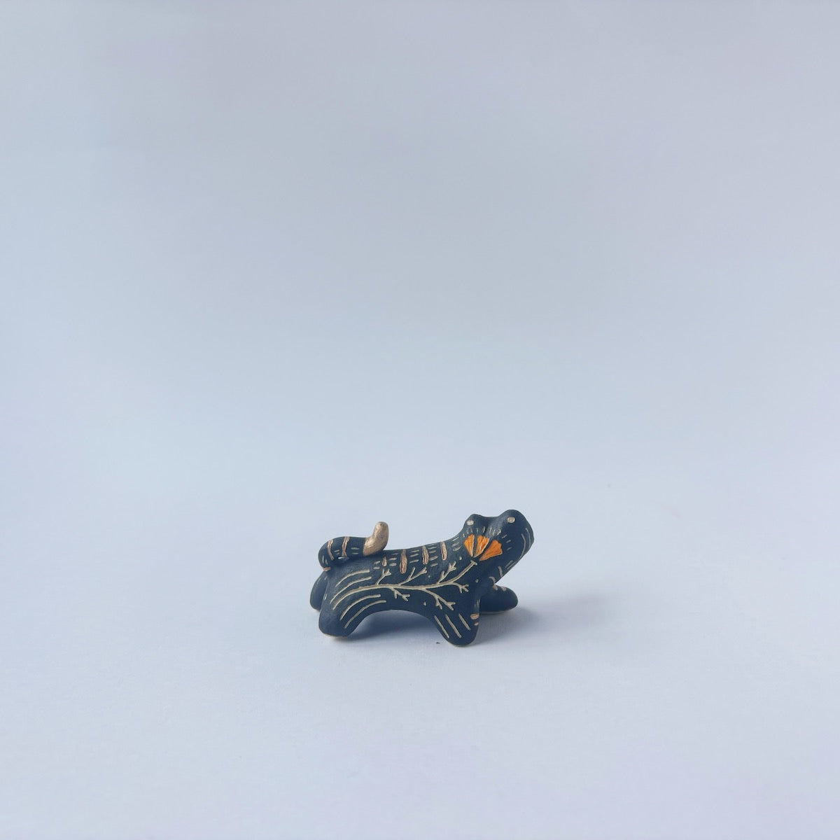Very small black sgraffito ceramic sculpture of a tiger, with a long body and a carved pattern of orange poppy flowers.