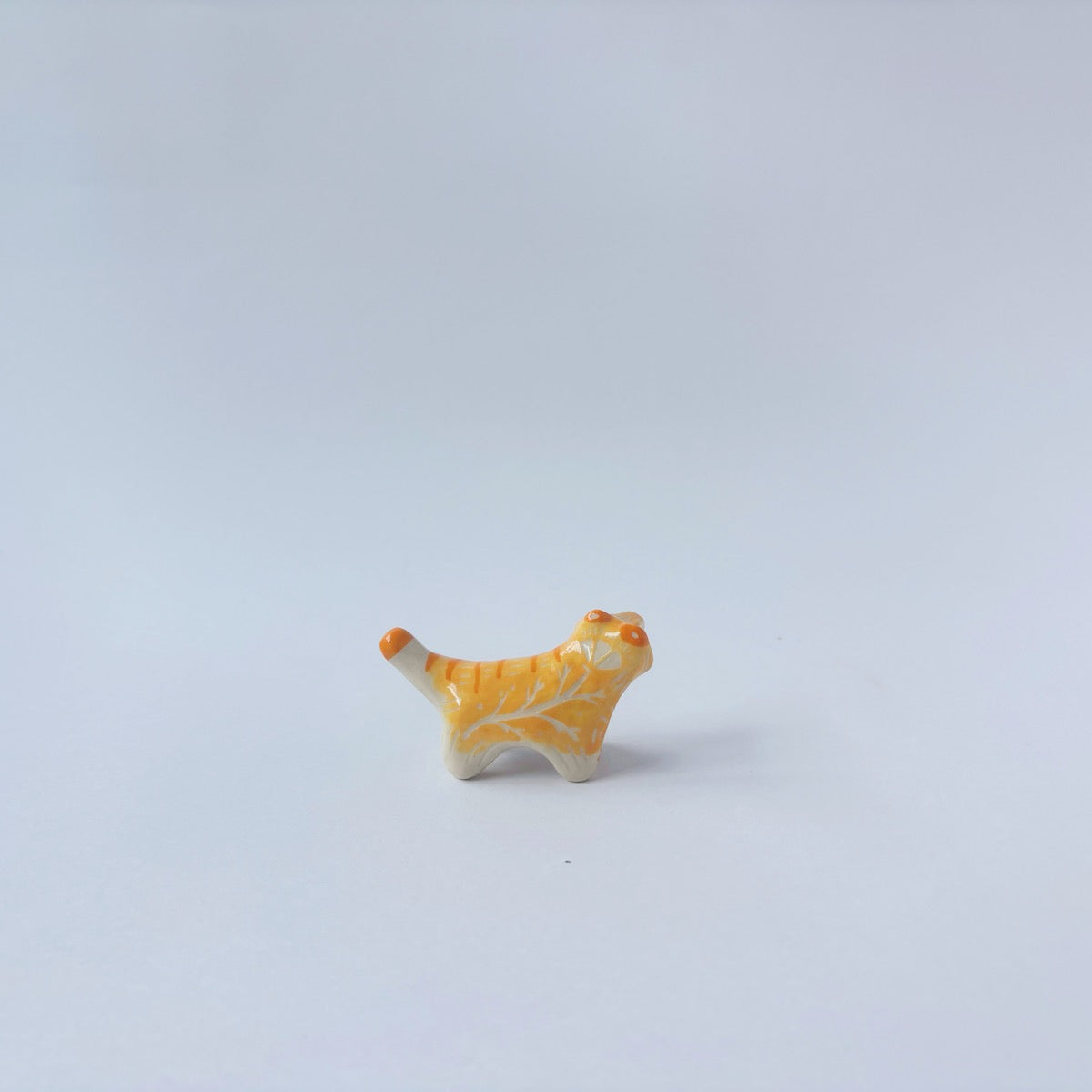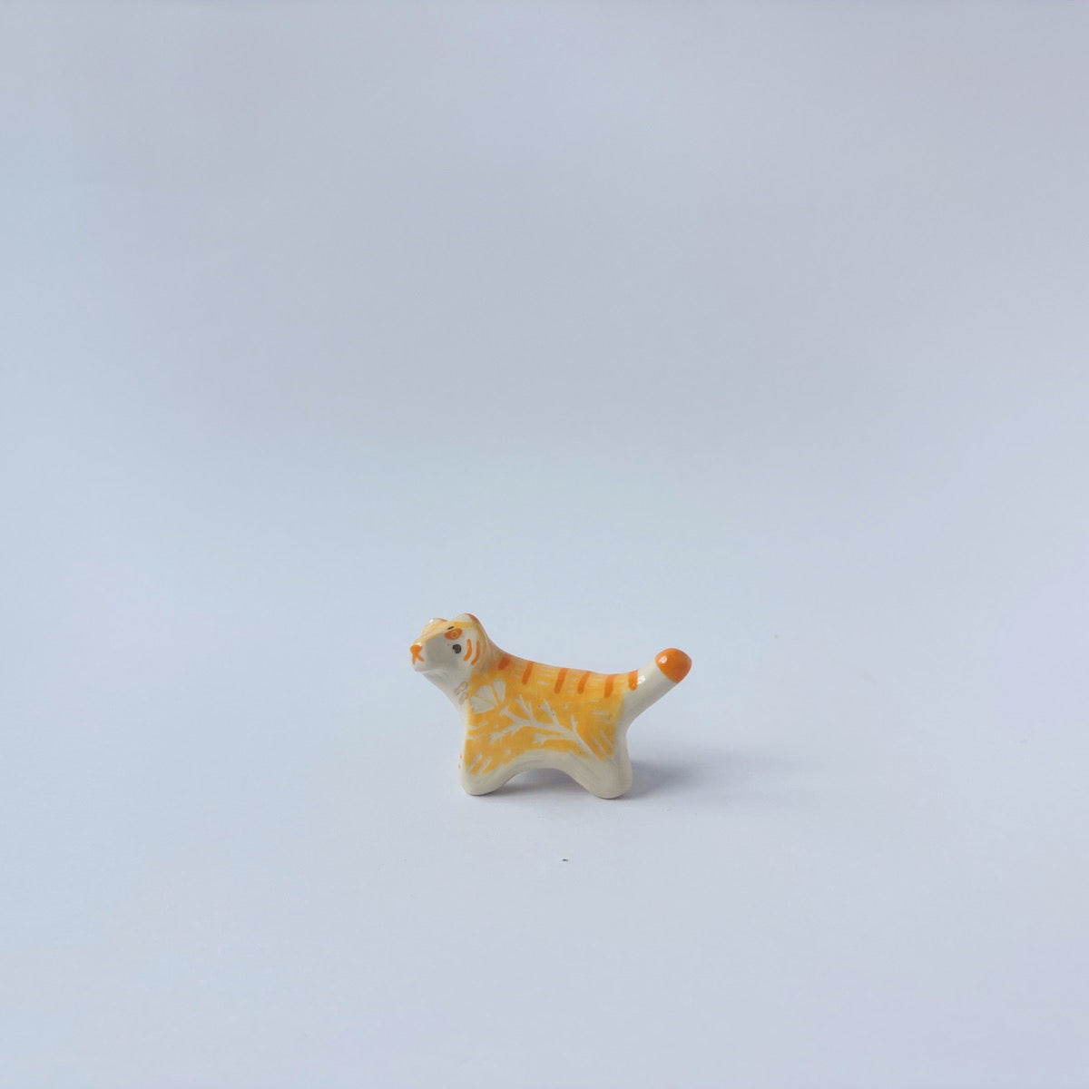 Very small ceramic sculpture of an orange and white tiger with gold detailing,