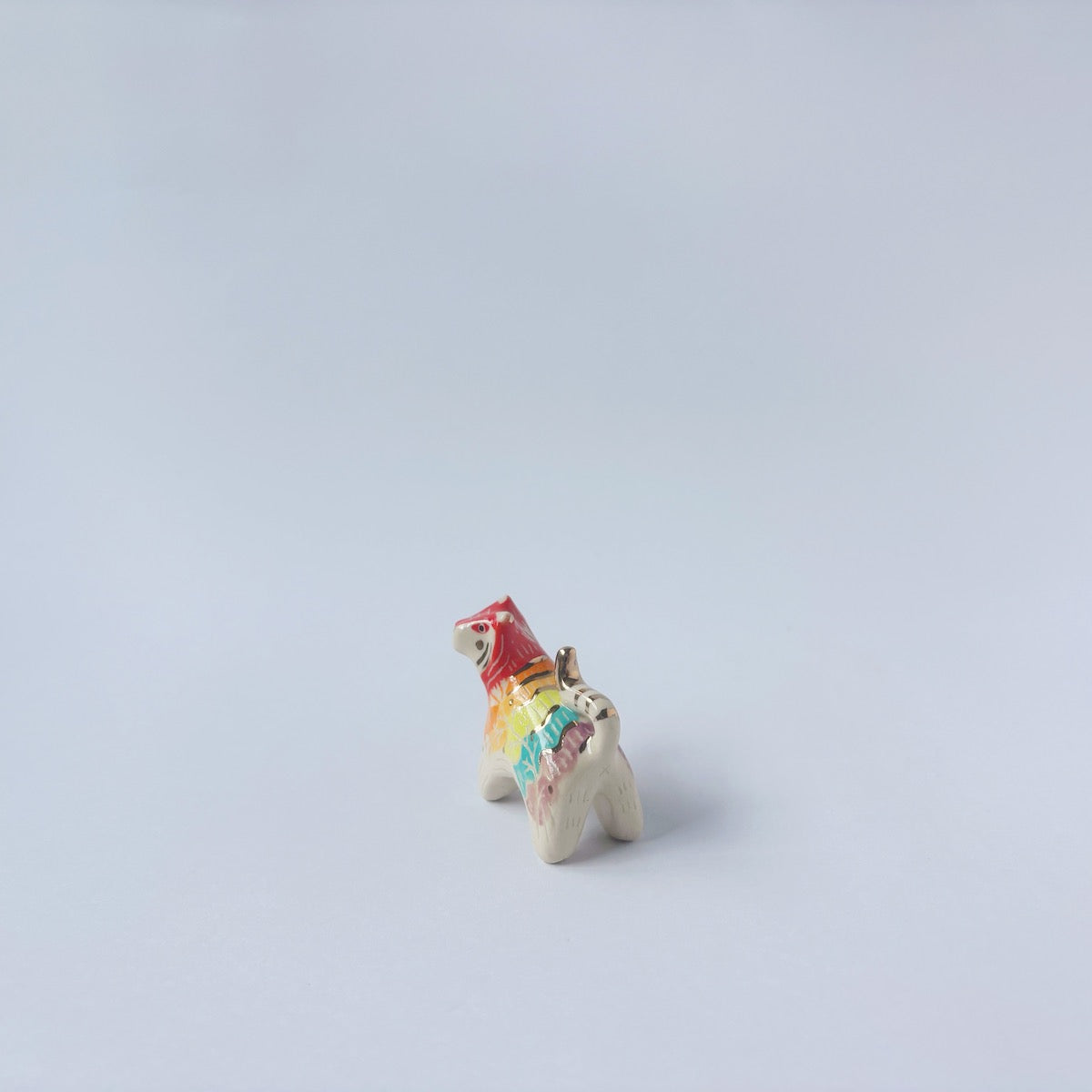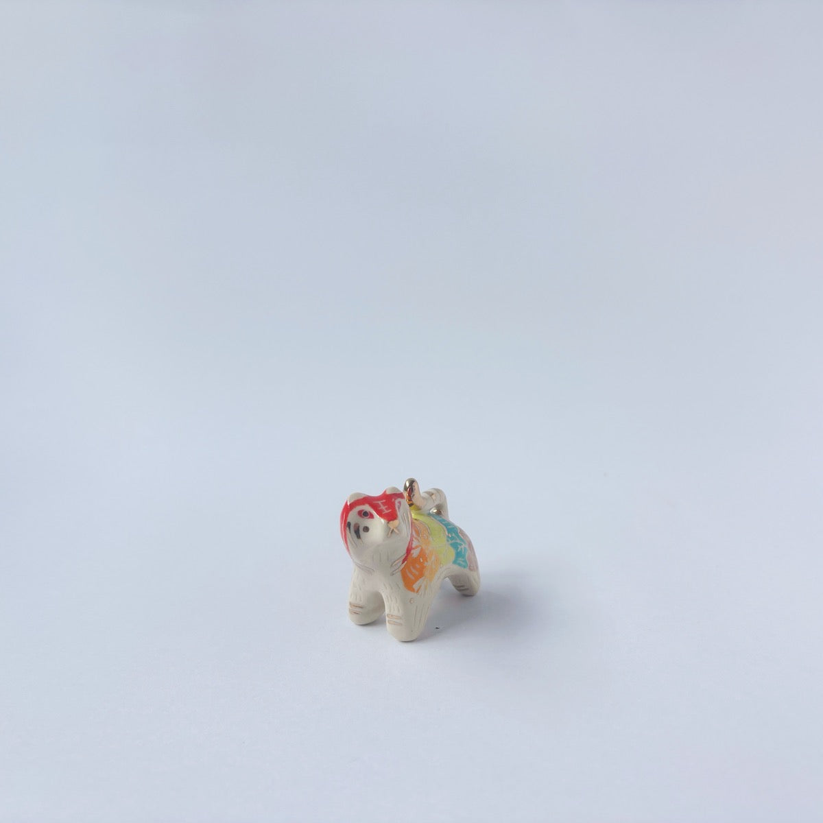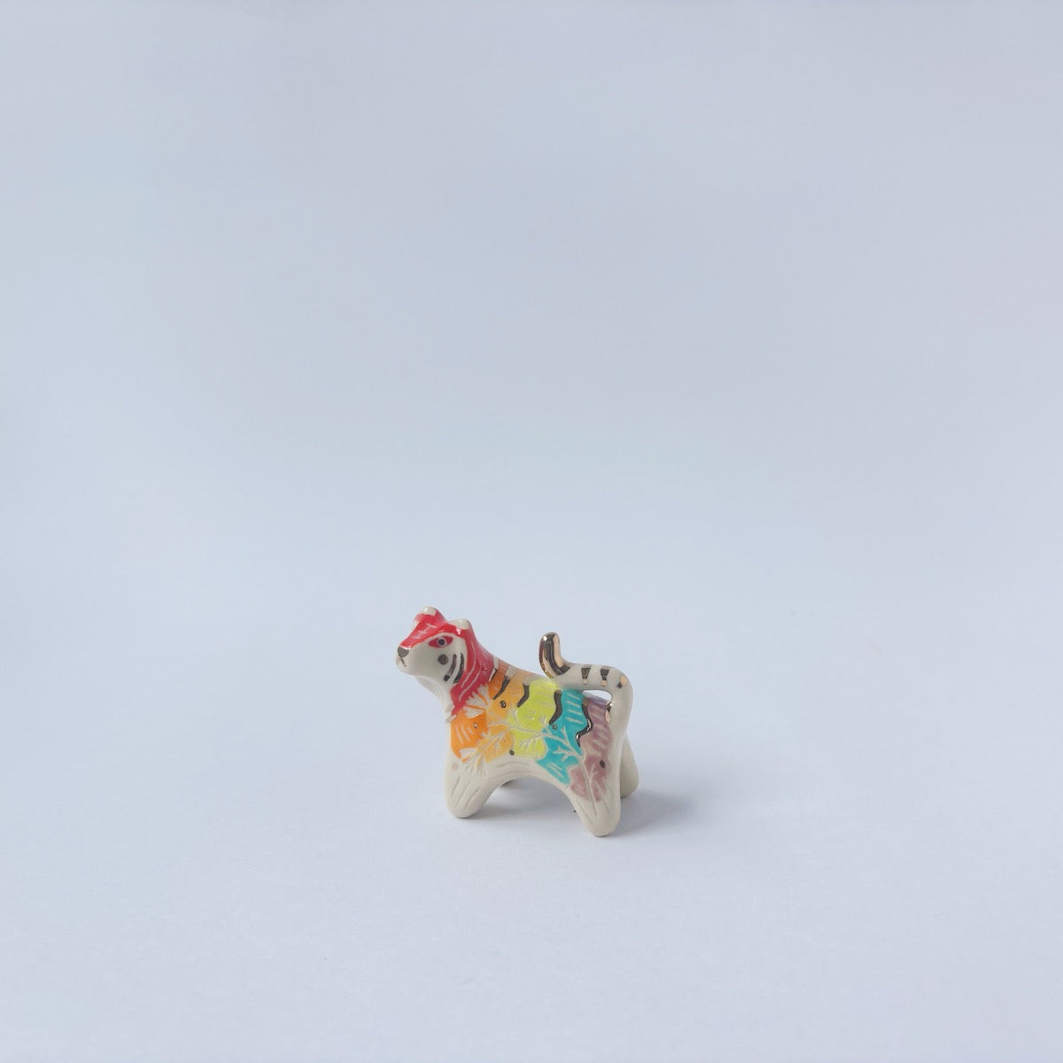 Very small ceramic sculpture of a tiger with a white underbelly and rainbow coloring on its back with gold detailing.
