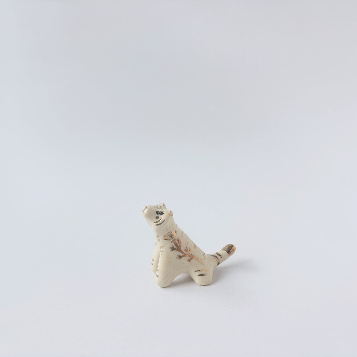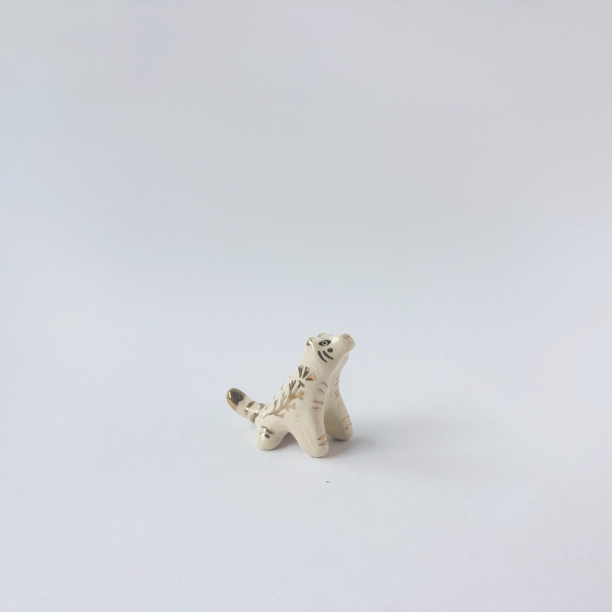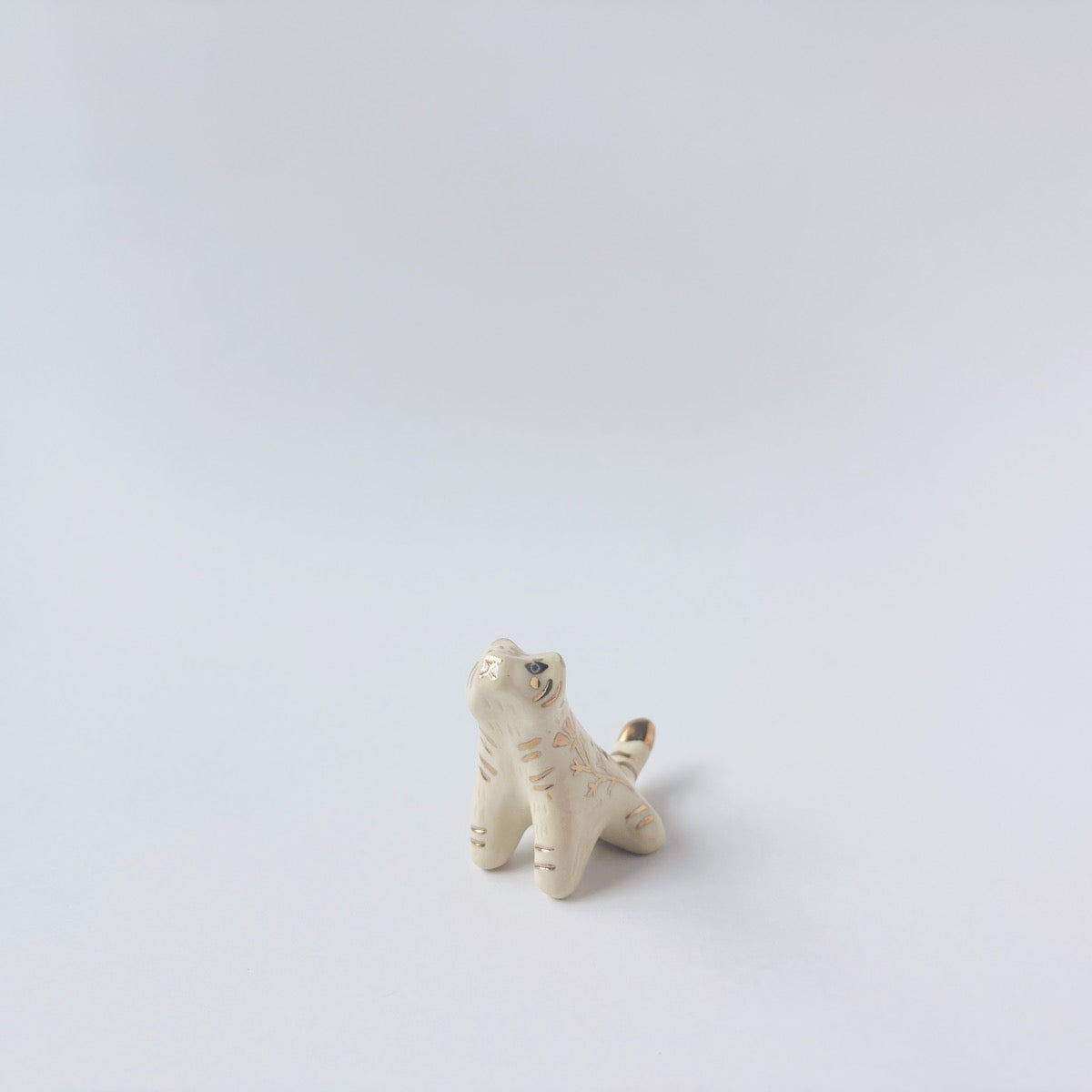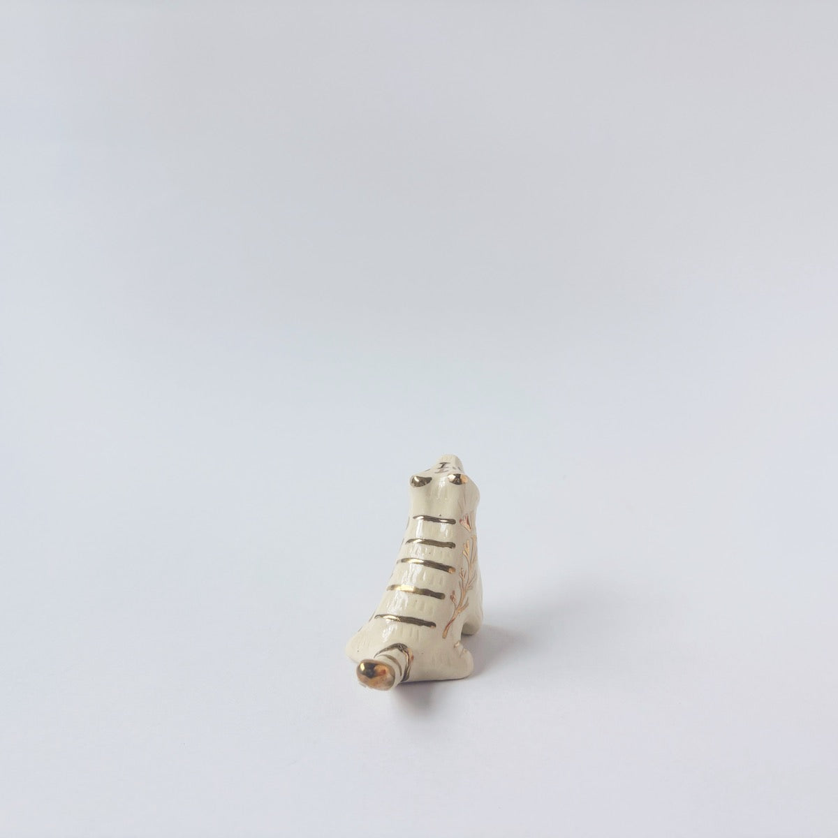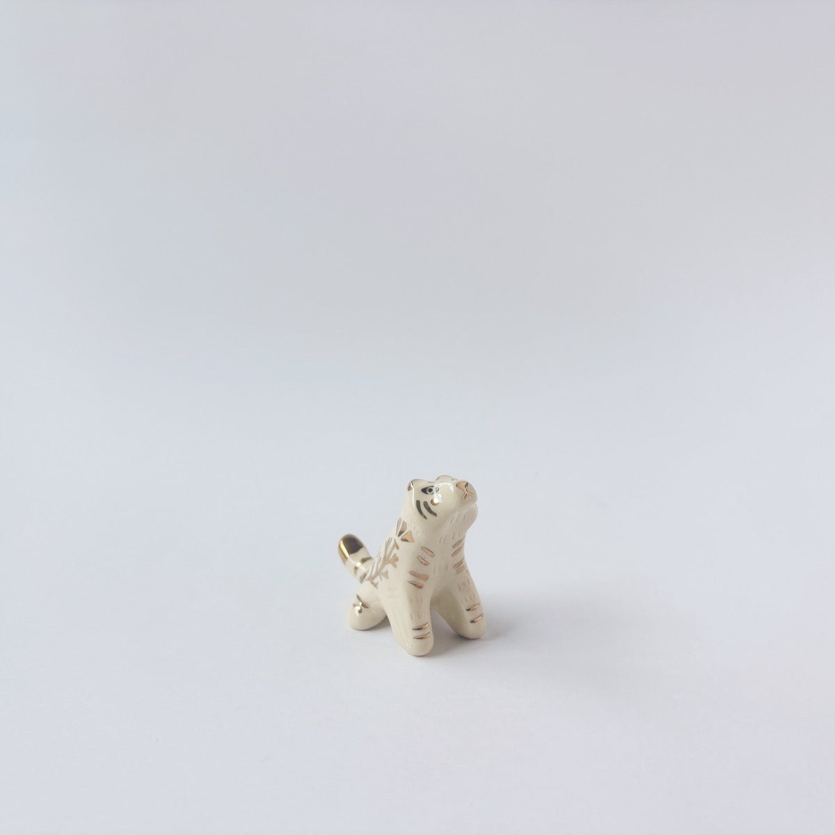 Very small glossy ceramic tiger sculpture, white with gold stripes and golden poppy flower design on its fur. It sits with a cute, happy expression.