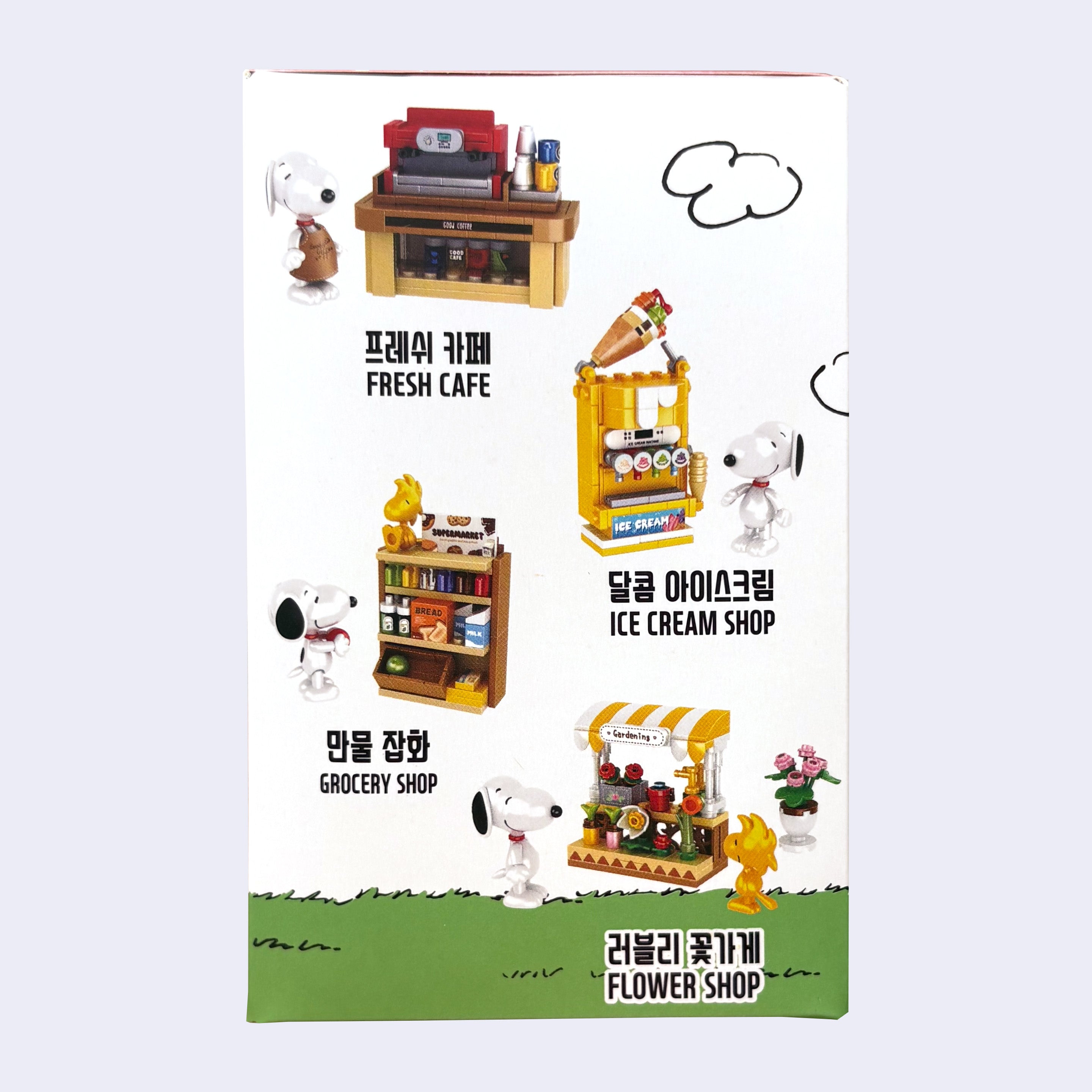 Side view of the Peanuts Supermarket Puzzle Blind box showing 4 options: fresh cafe, ice cream shop, grocery shop or flower shop.