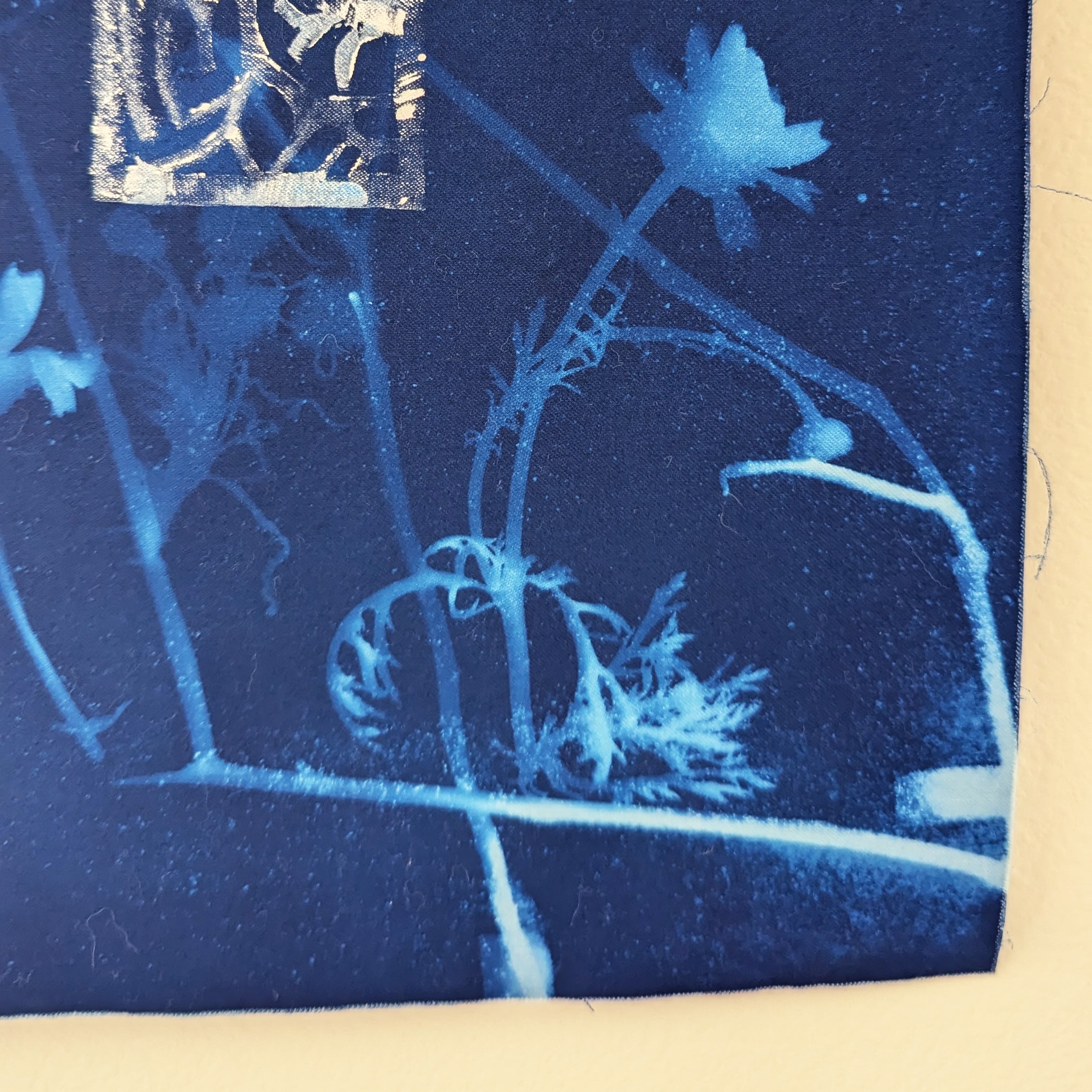 Cyanotype, seawater, linocut, driftwood.