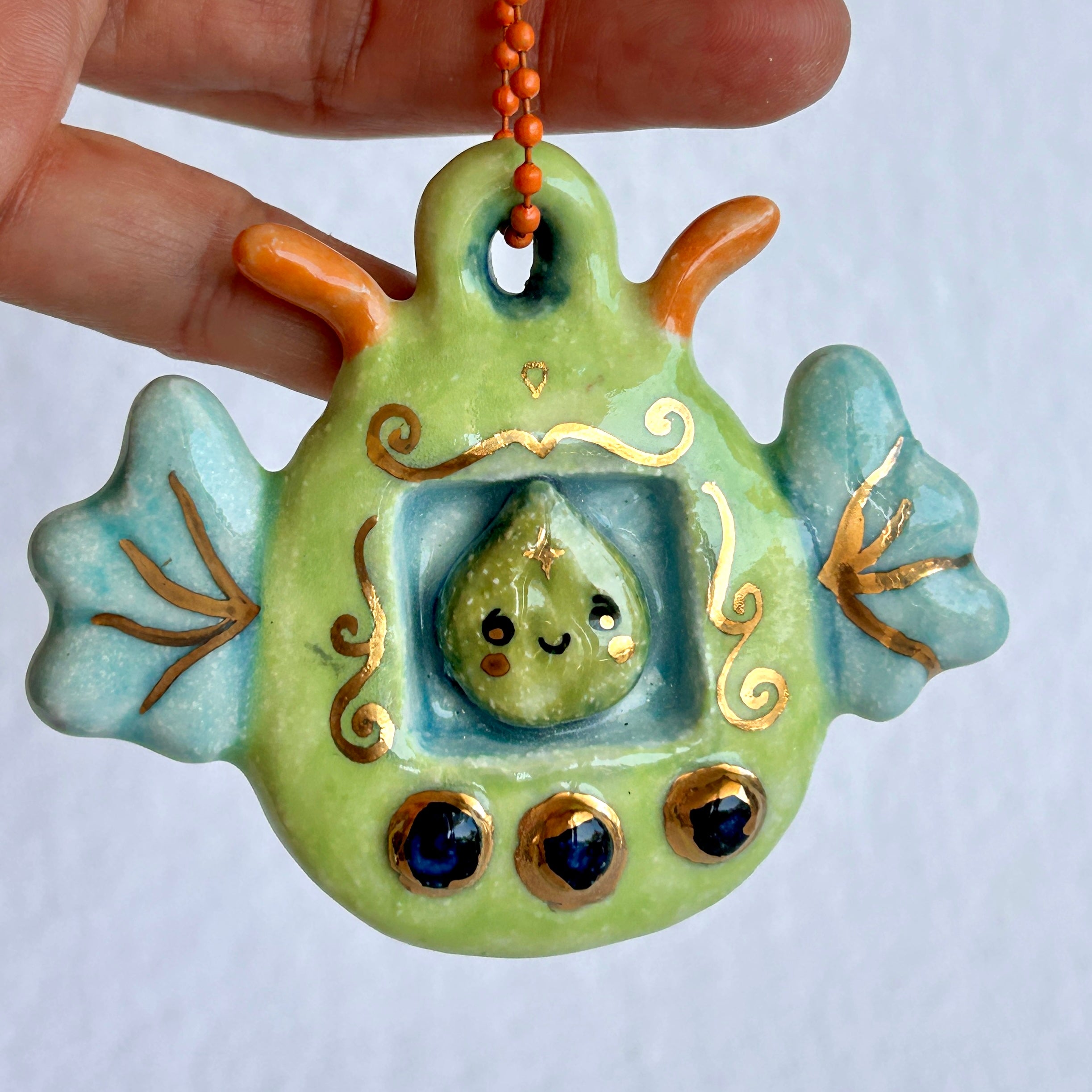 Glossy ceramic sculpture of a leaf themed Tamagotchi toy, with a small green leaf as the inner character and gold gilded patterning and buttons. On the side of the Tamamgotchi are leaf shaped wings and atop are orange antennae.