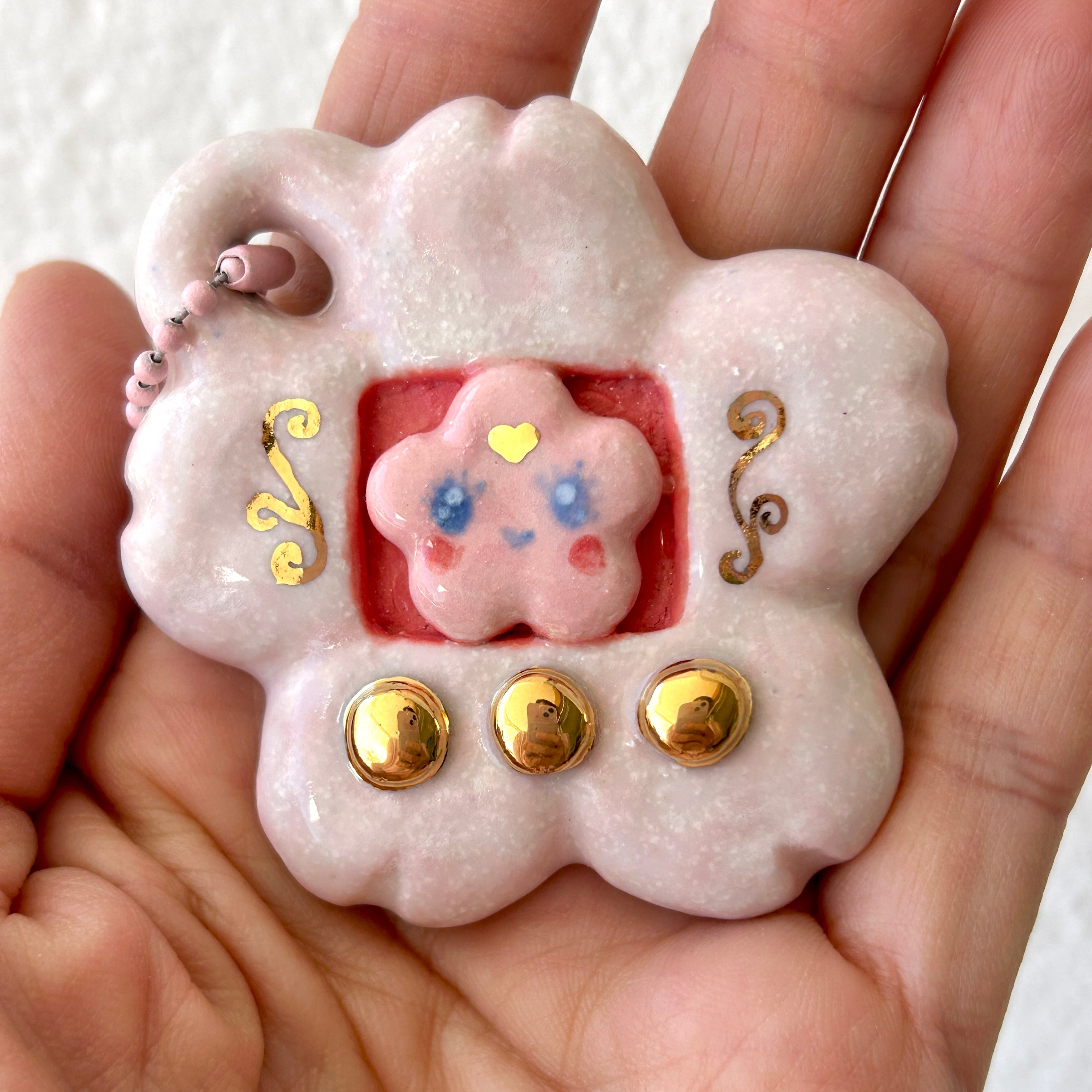 Glossy ceramic sculpture of a Tamagotchi toy with a pink cherry blossom shaped body and a small cherry blossom character inside. Gold gilded patterning and buttons are on the toy and it is attached to a chain.