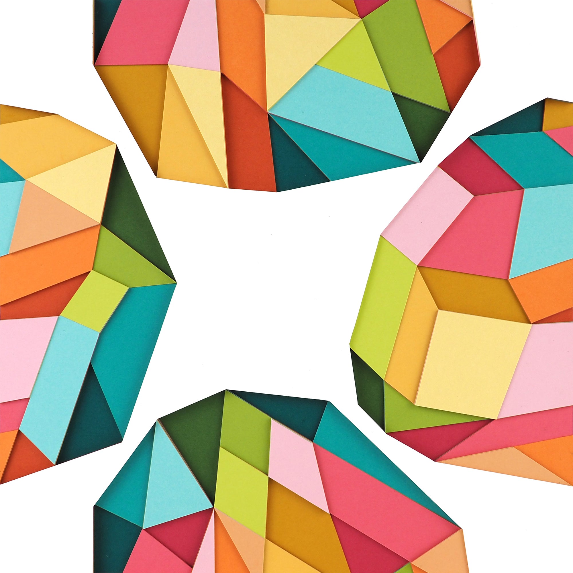 White paper with 4 colorful geometric shapes on each side of the sheet, made up of layers of colorful paper assembled into a larger geometric shape.