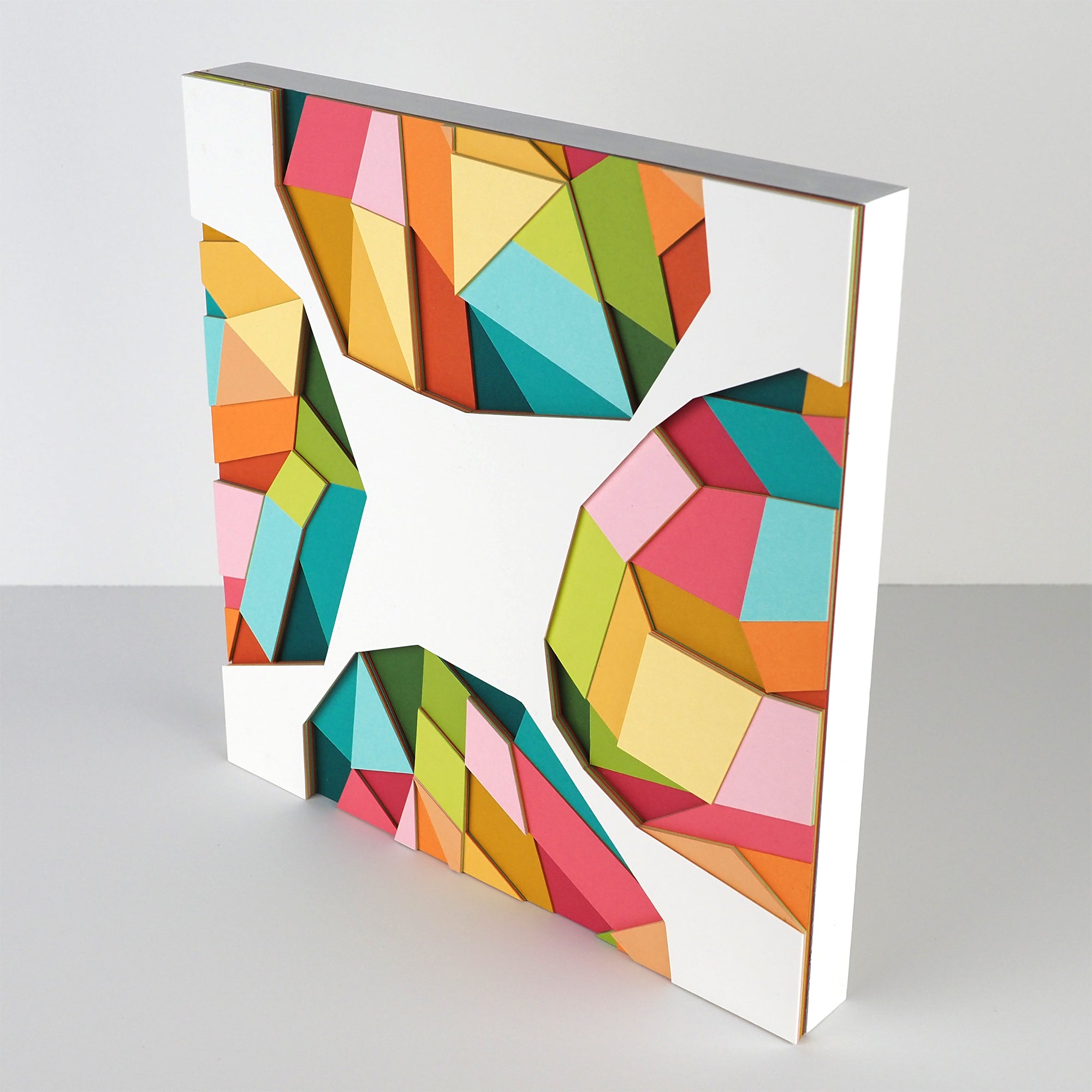White paper with 4 colorful geometric shapes on each side of the sheet, made up of layers of colorful paper assembled into a larger geometric shape. Shown at the side to display 3 dimensionality
