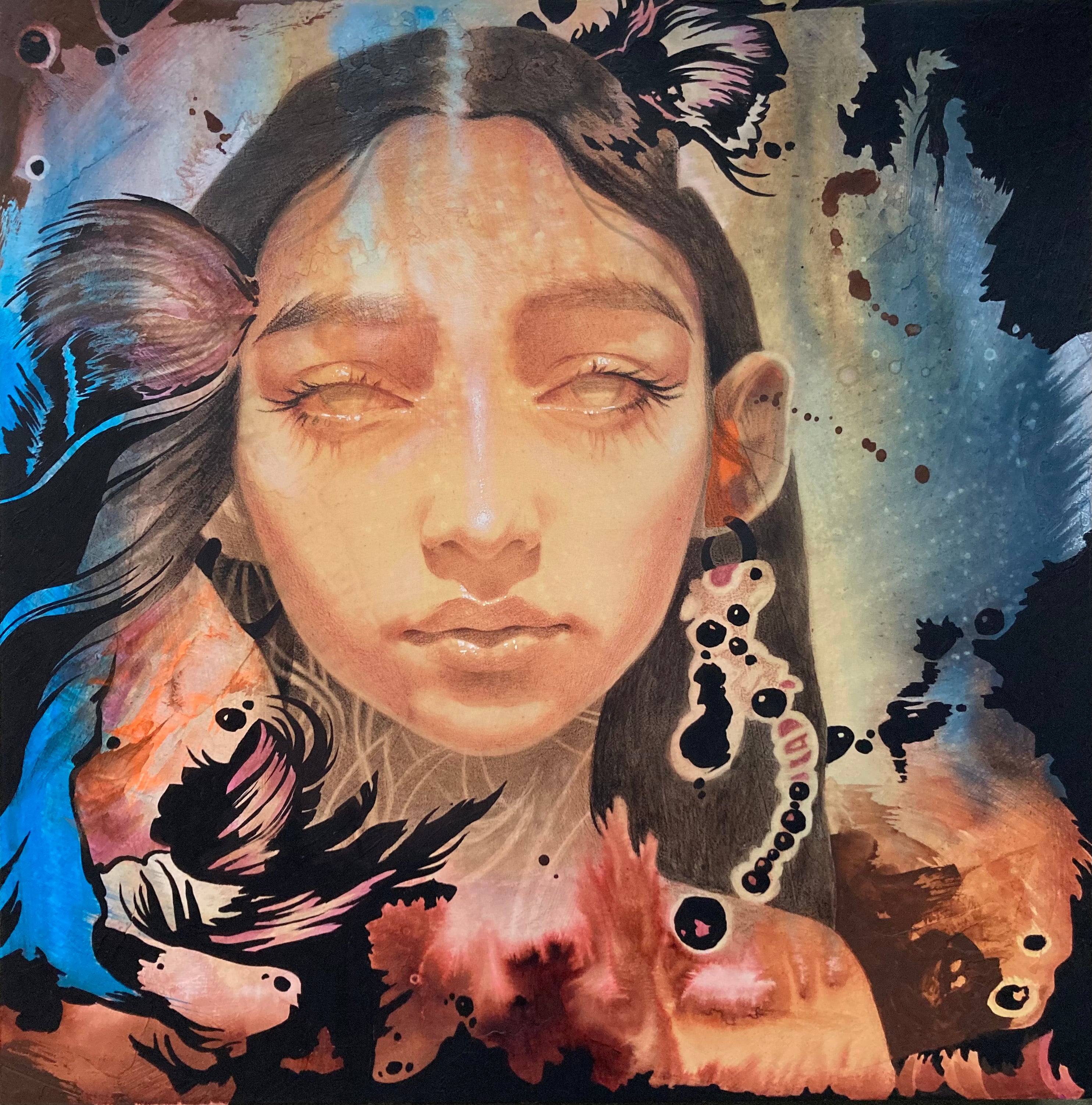 Mixed media on wood panel.