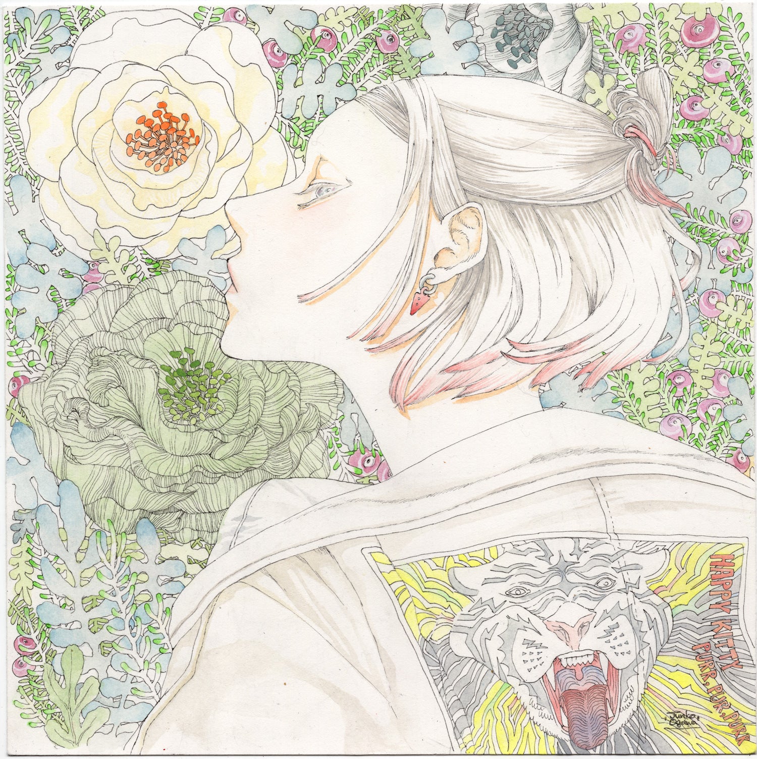 Pen and watercolor. Piece is framed.