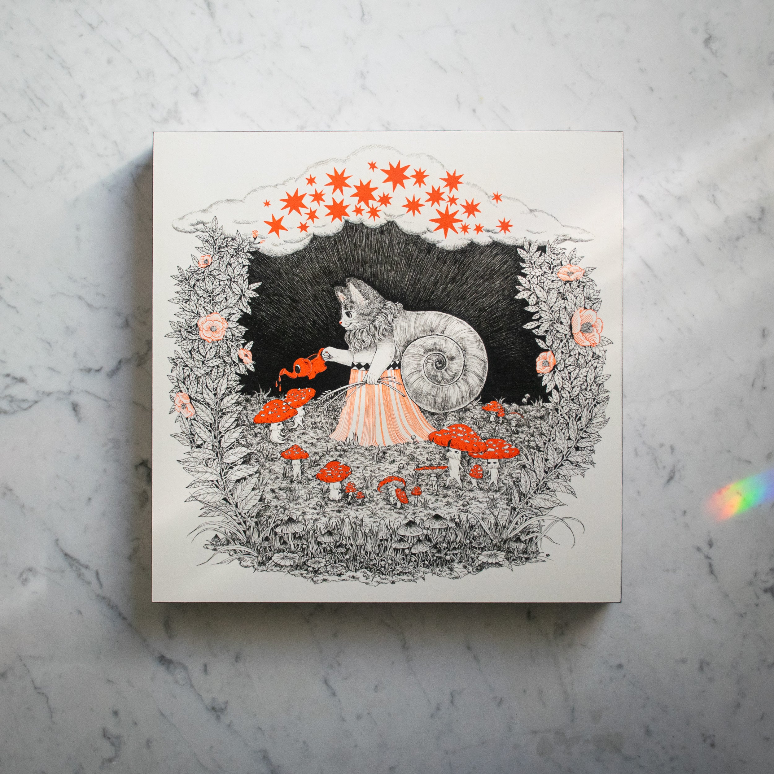 Pen and ink drawing on Arches watercolor paper, mounted on wood panel.