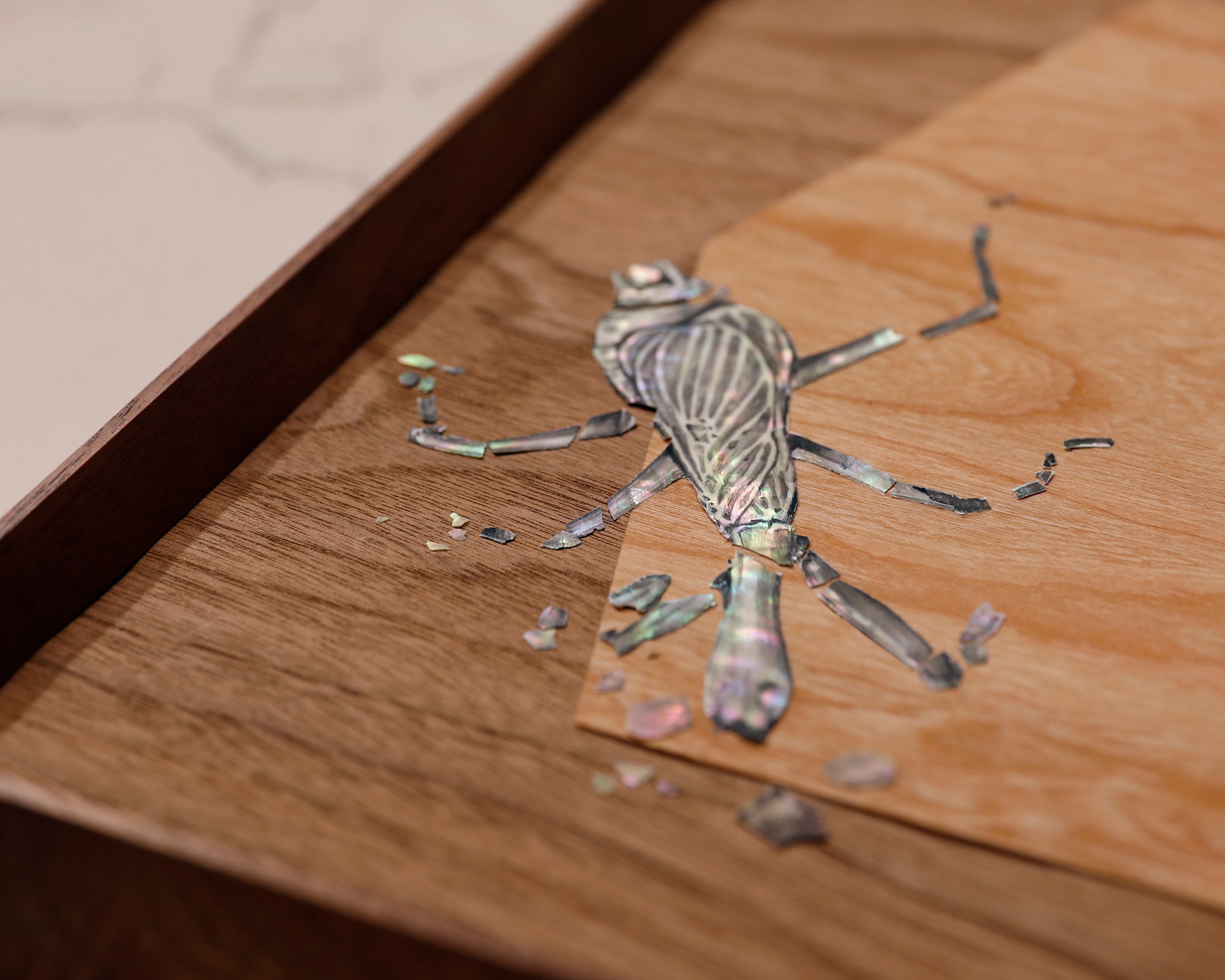 Graphite, gouache, Sumi Ink, Mother of Pearl, Cherry Wood and Walnut Wood.