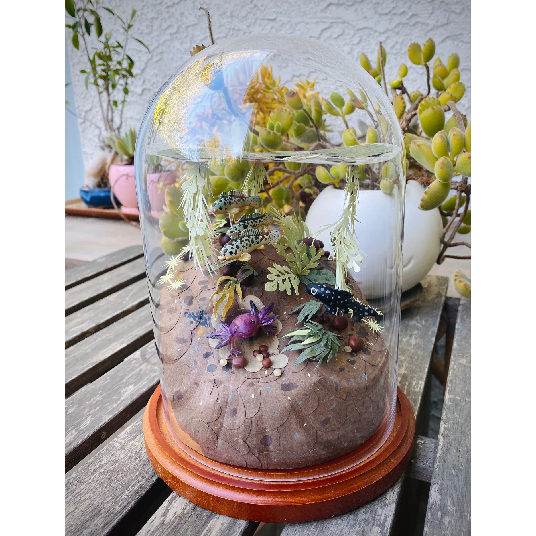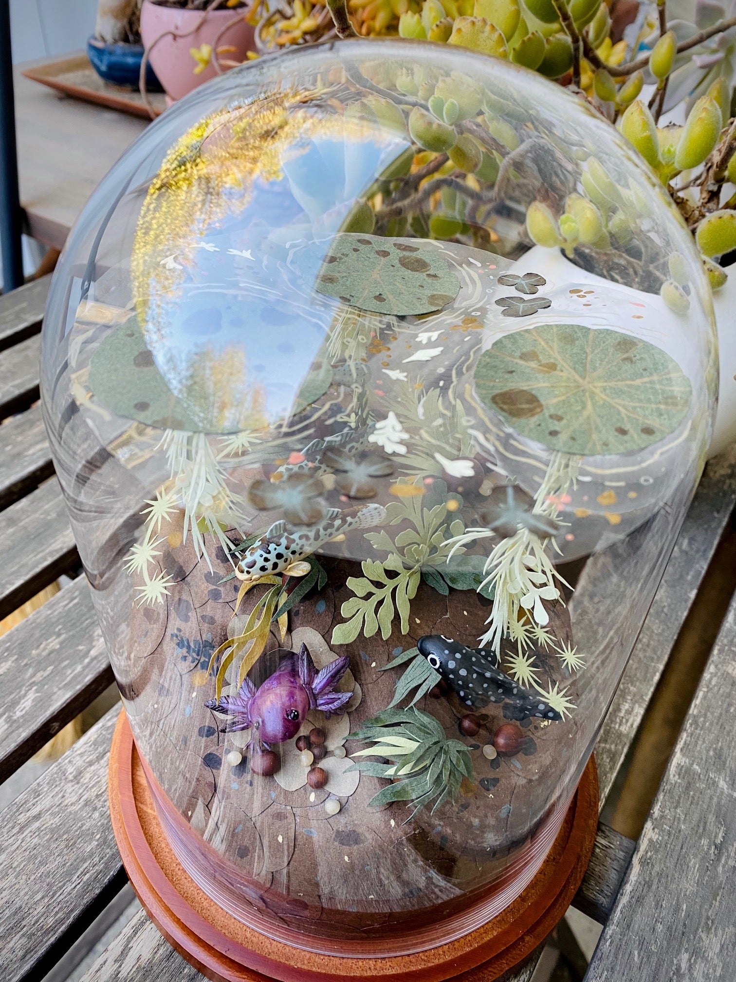 Glass cloche display: mixed media with Super Sculpey Clay, acrylic paint, gouache on Cason Paper.