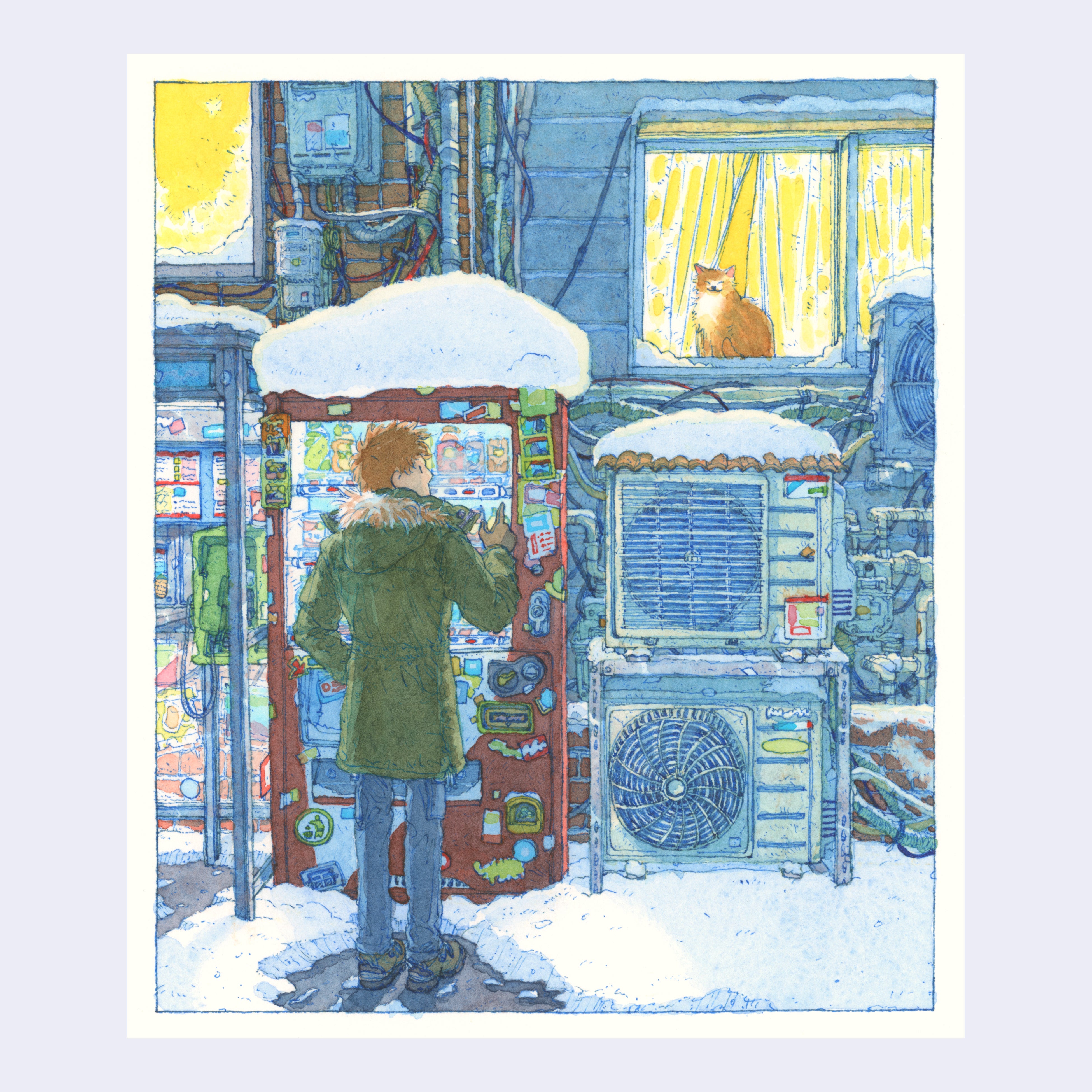 Watercolor, gouache and ink on paper. Piece is framed.