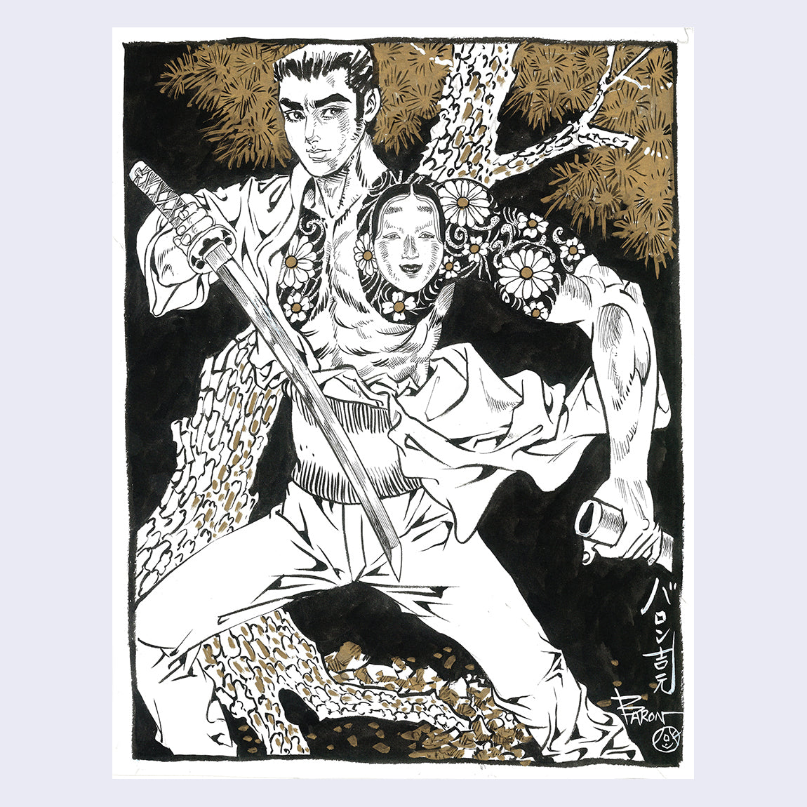 Paper measures 8.5 inches by 11 inches. Sumi-ink and acrylic gold on paper.